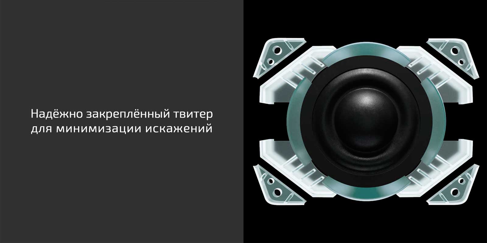 Твитер, закрепленный в собственном корпусе для дополнительной стабильности, помогает уменьшить искажения и обеспечивает четкие высокие и насыщенные средние тона, что позволило сконцентрировать мощь НЧ-динамика на басах. Во многом