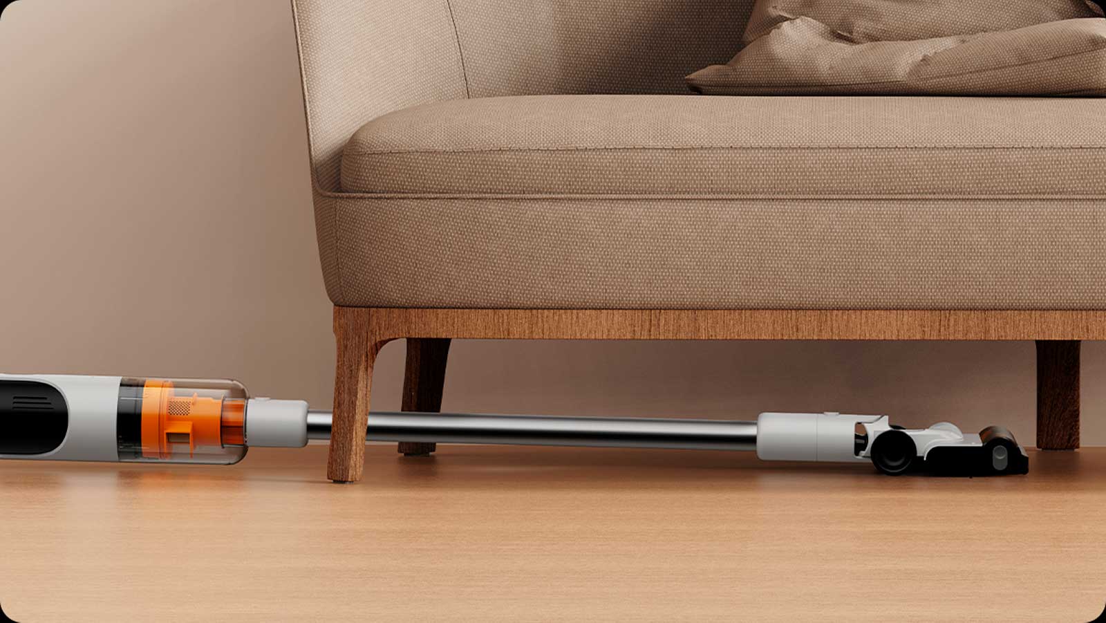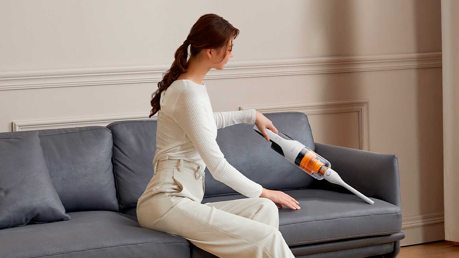 добавляют яркие оранжевые вставки – они есть на щетке в виде полосок и в системе фильтров. Deerma T10W выглядит не как инструмент для уборки, а как современный гаджет.