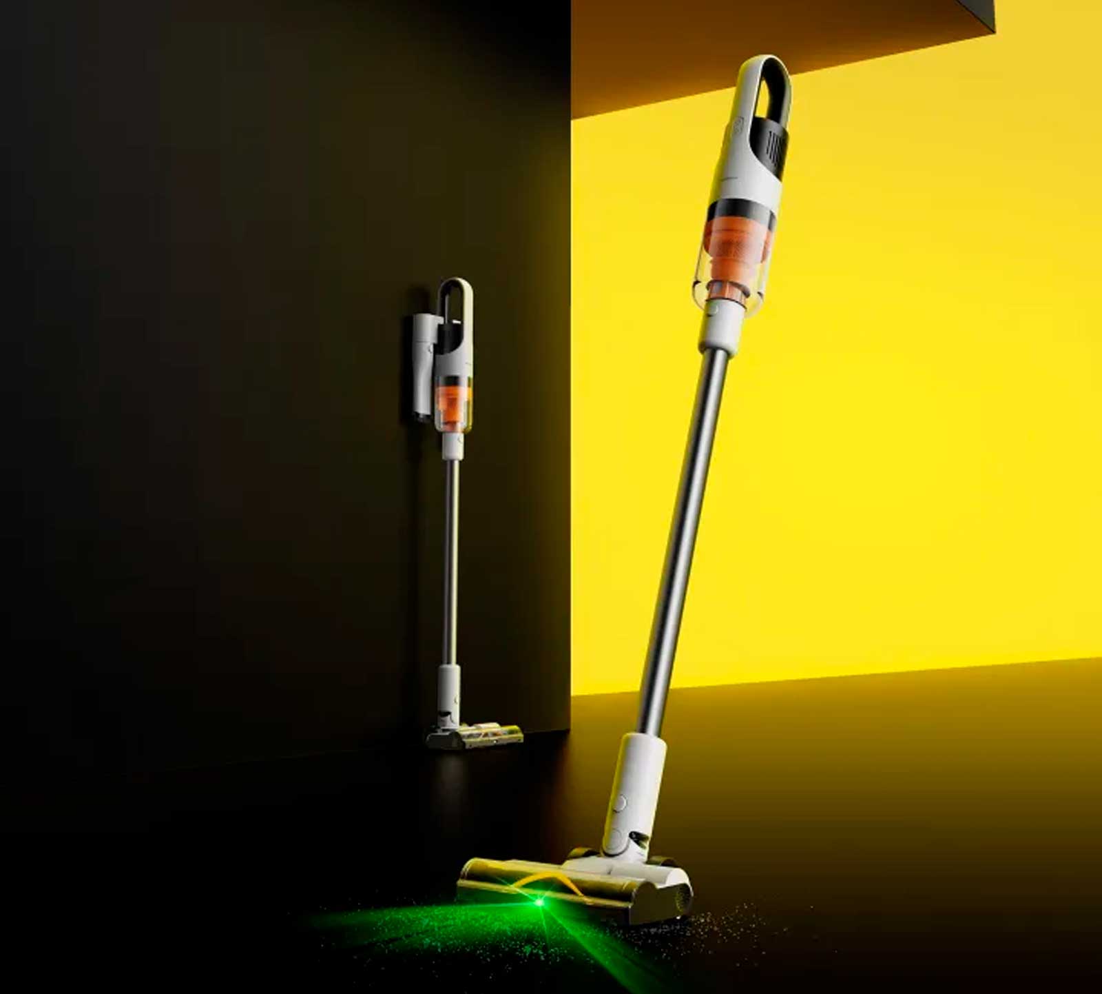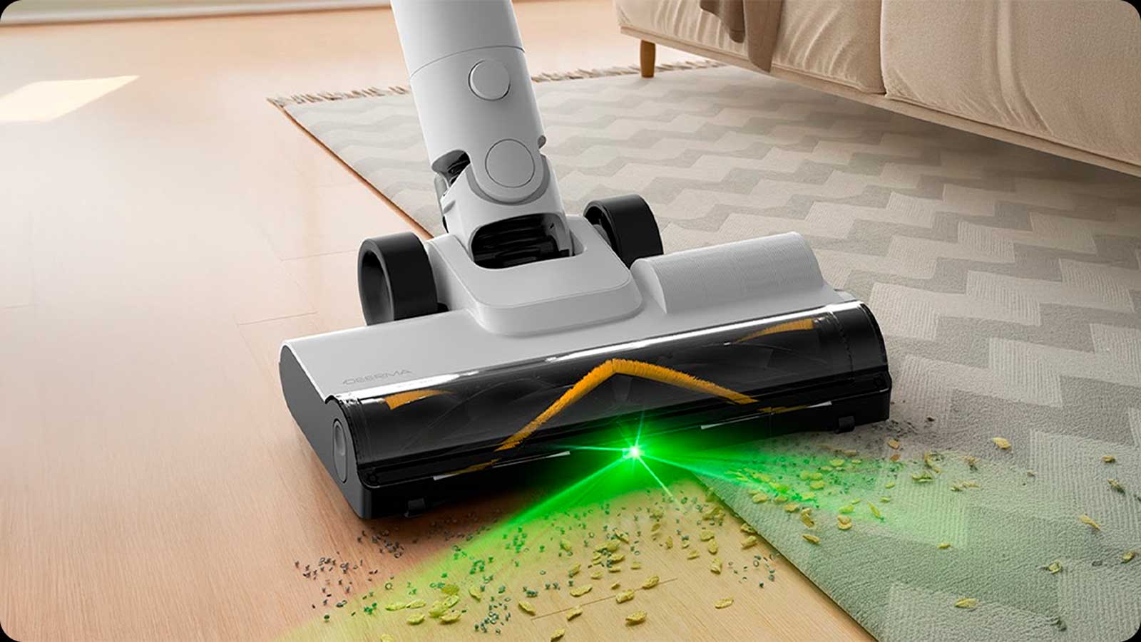 В главной щетке предусмотрена встроенная зеленая подсветка. Оно подсвечивает мусор на темных поверхностях, под мебелью или в углах, где плохое освещение. С таким решением ничего не ускользнет — вы будете видеть пыль еще до того, как