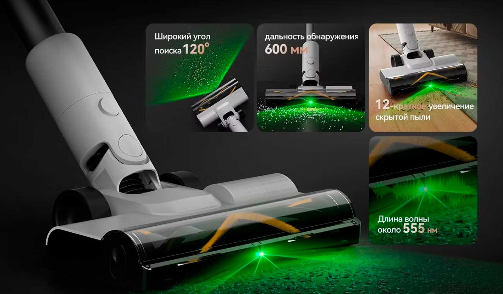 В условиях недостаточной освещенности или на коврах со сложной цветовой гаммой технология обнаружения пыли с 12-кратным увеличением с помощью зеленого света позволяет эффективно выявлять пыль и мельчайшие частицы, точно определять и