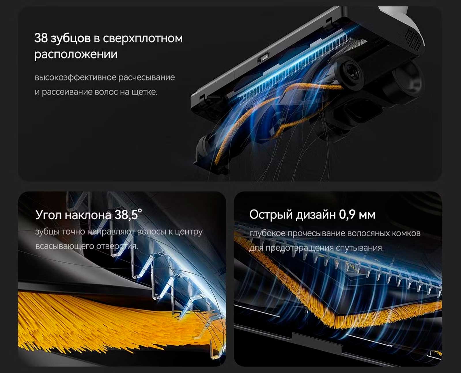 Специальная V–образная спиральная щётка в сочетании с мощным всасыванием 21 кПа всего устройства, предназначена для всасывания волосков и их рассеивания по спирали, что значительно усиливает эффект очистки и эффективно предотвращает