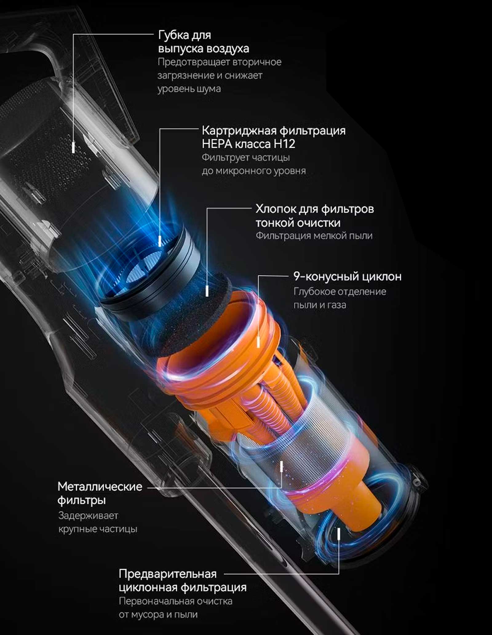 Встроенный 9–конусный циклонный сепаратор отделяет пыль от воздуха с помощью мощной центробежной силы, а затем проходит многоступенчатую фильтрацию, чтобы пыль оставалась внутри пылесборника, предотвращая повторный поток.