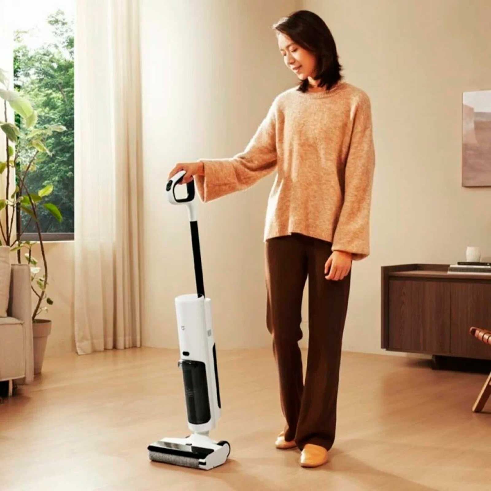 Беспроводной моющий пылесос Mijia Wireless Floor Scrubber 2C — универсальное средство для уборки гладкого пола. Он одновременно пылесосит, собирает пролитые жидкости, моет пол и стерилизует. Продвинутая турбощётка эффективно собирает волосы, шерсть животных и грязь. Уникальная конструкция позволяет легко убирать под мебелью, а функция самоочистки избавляет от необходимости мыть пылесос вручную. LED-экран и кнопки на рукояти делают управление простым и удобным. Все это сделает ваш дом безупречно чистым.