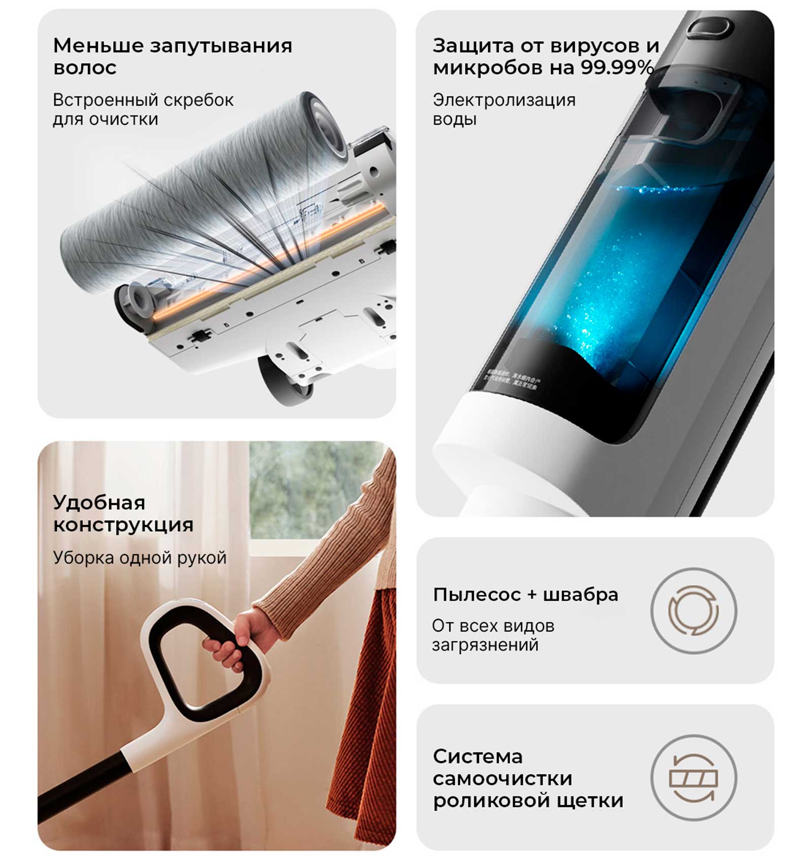 Роликовая шетка позволяет отчистить и отмыть даже стойкие загрязнения. Скорость вращения щетки достигает 500 об/мин. Она постоянно промывается электролизованной водой в режиме реального времени, обеспечивая качественную уборку и защищая от вторичного загрязнения. Влажная уборка дома - быстро и легко!