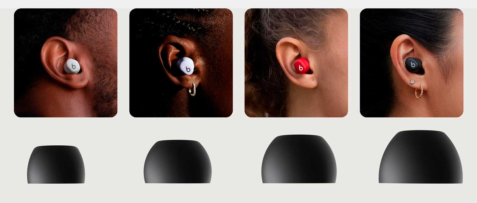 Эргономичный дизайн наушников включает в себя насадки, расположенные под углом, чтобы соответствовать естественной форме слухового прохода. Наушники Beats Solos Buds поставляются с четырьмя размерами ушных вкладышей (XS, S, M, L),