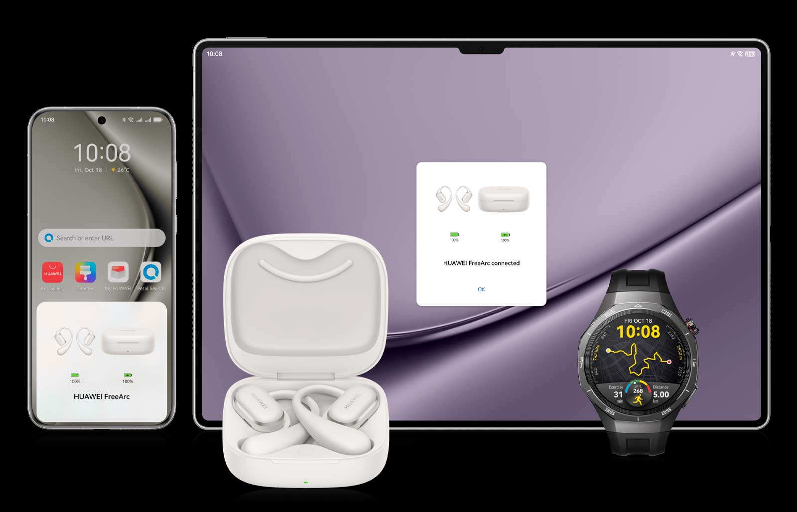 Подключайте наушники HUAWEI FreeArc сразу к двум устройствам, таким как смартфоны, планшеты, компьютеры или часы. Легко и быстро переключайтесь между ними, и не важно, какая система установлена на устройстве, будь это iOS, Android