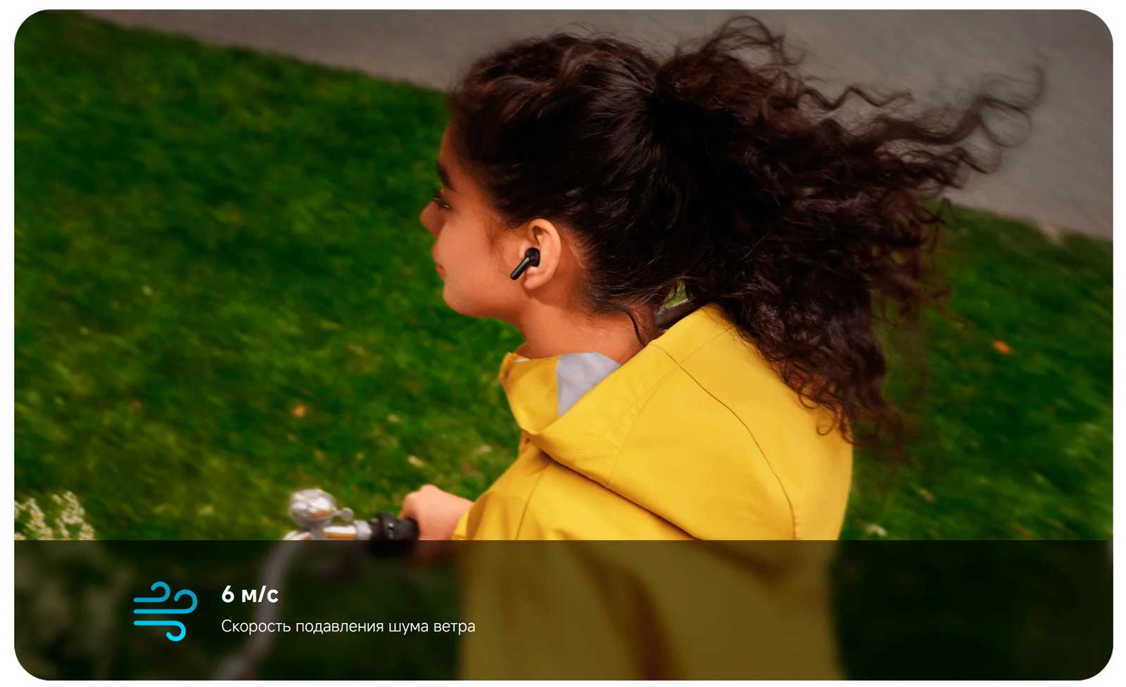 Благодаря оптимизированной структуре подавления шума ветра и интеллектуальному алгоритму его обнаружения, наушники сохраняют чёткость звука при скорости ветра до 6 м/с. Даже в ветреных условиях они эффективно снижают помехи,
