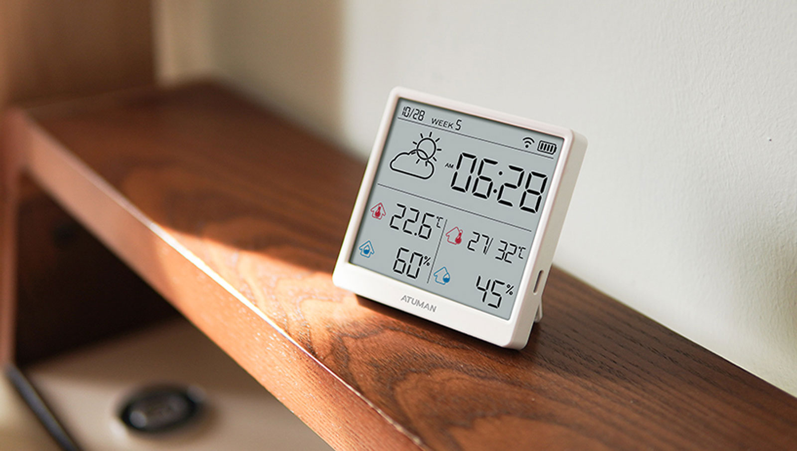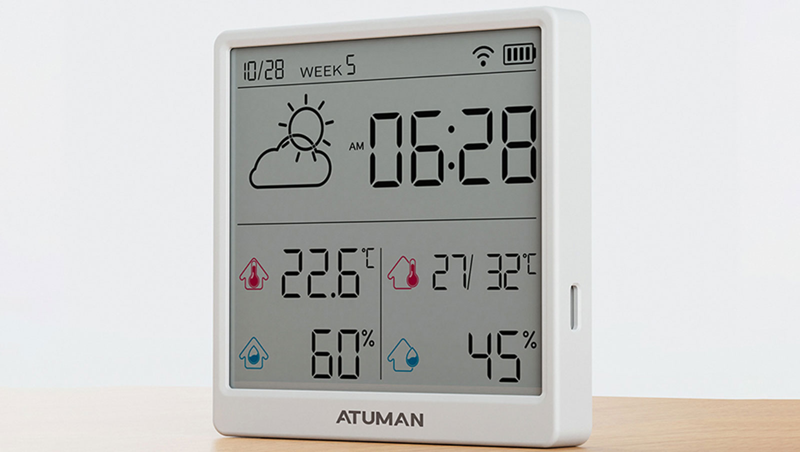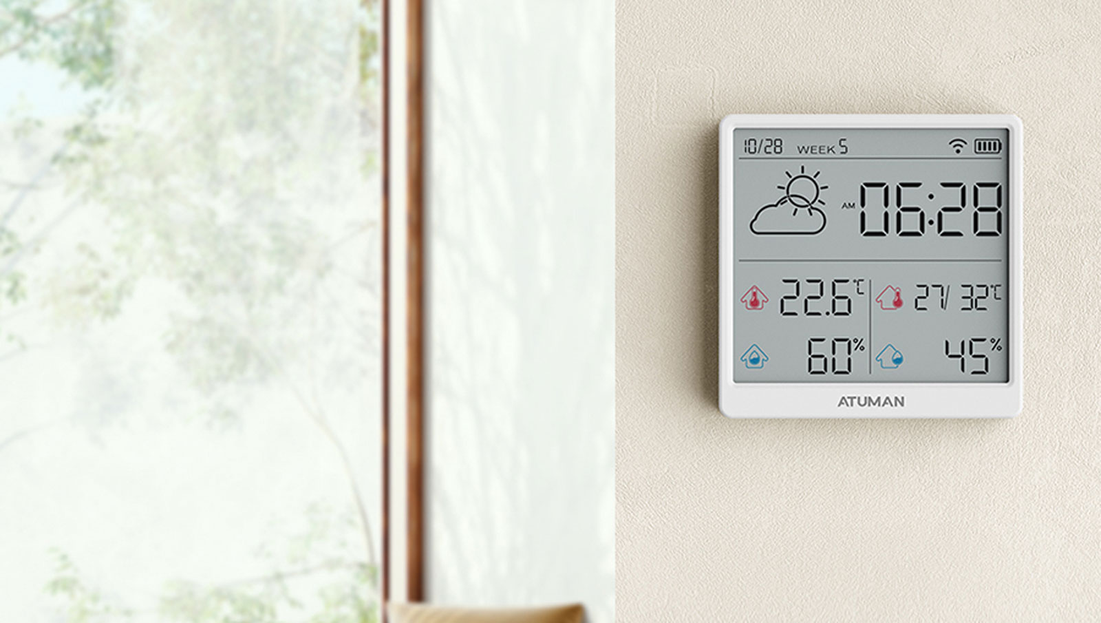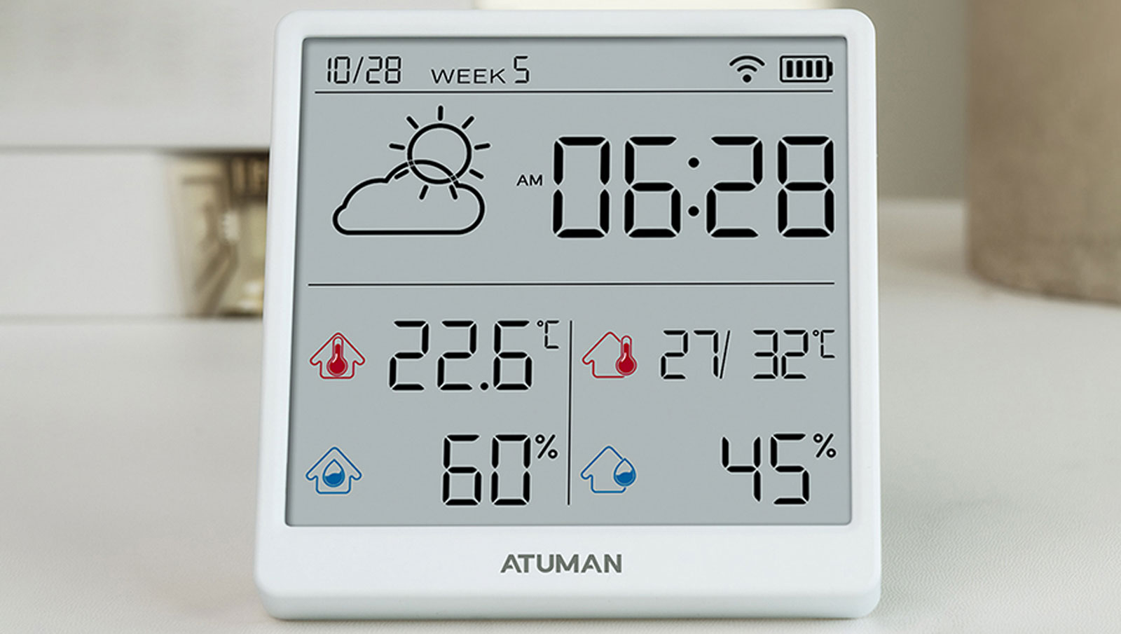 Датчик температуры и влажности Atuman TH3 может подключаться к сети WIFI, обеспечивая отображение температуры и влажности в помещении и на улице в режиме реального времени. Значок погоды меняется в зависимости от погоды на улице.