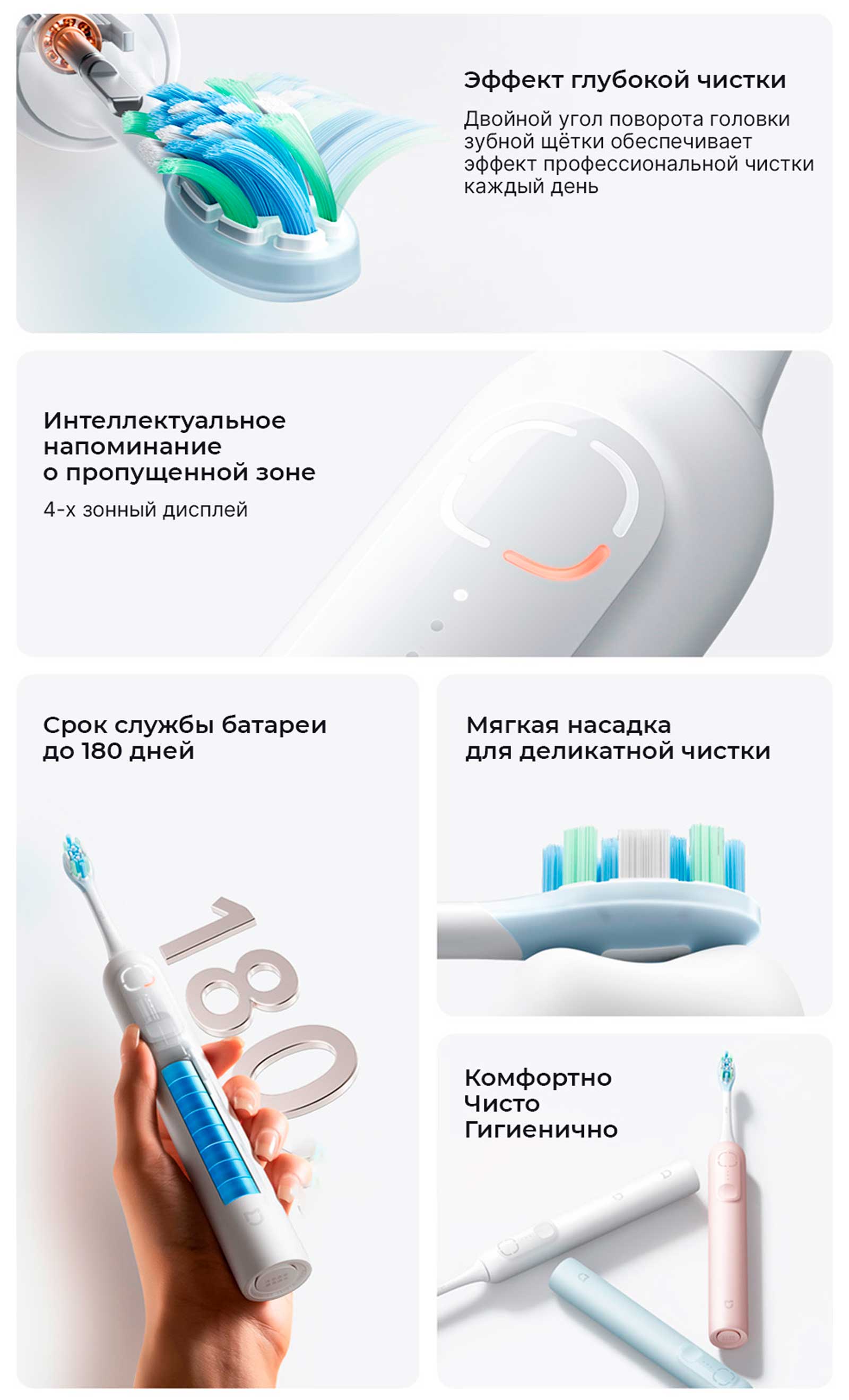 Умный индикатор напомнит о замене щетинок, а водонепроницаемость IPX8 и длительное время работы до 180 дней делают эту щётку надежным помощником в повседневной гигиене.