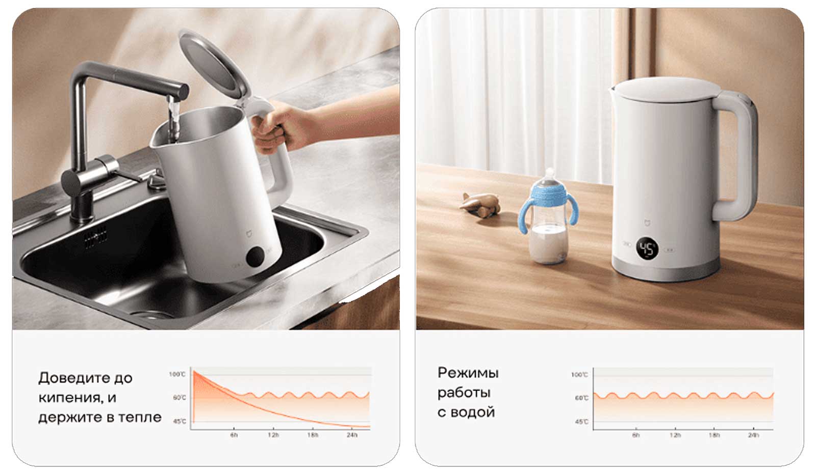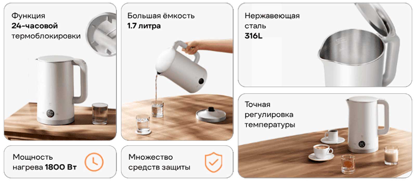 высоких температур во время кипячения, внешняя часть остается прохладной и безопасной на ощупь. Эта интеллектуальная конструкция эффективно предотвращает случайные ожоги, делая чайник безопасным для использования в присутствии