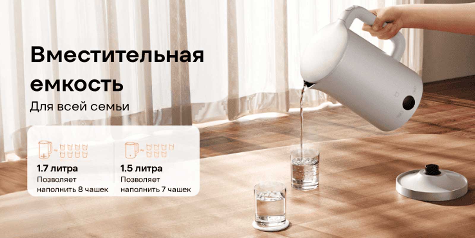 Благодаря большой емкости 1.7 литра чайник идеально подходит для семейного использования. Он избавляет от неудобств, связанных с частым кипячением воды для нескольких человек. Такой большой объем без труда удовлетворяет потребности