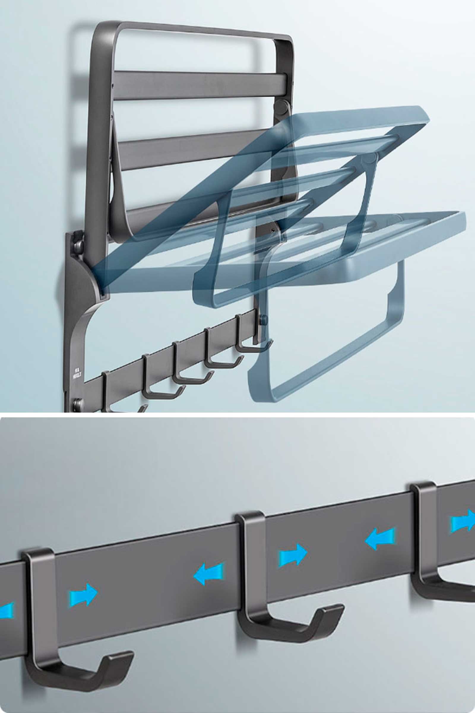 Многоярусная вешалка обладает цельным бесшумным складыванием, что позволяет экономить пространство. Легко складывается и раскладывается, а резиновая амортизация предотвращает шум и царапины. Подвижные крючки можно размещать по своему усмотрению.