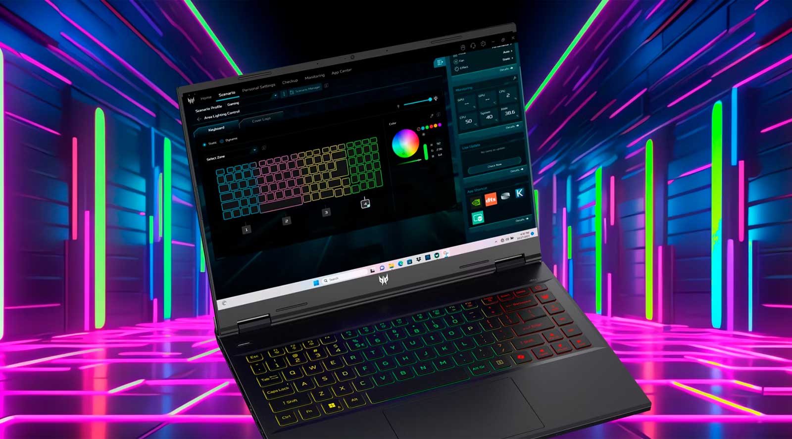 Наслаждайтесь точным управлением с помощью PredatorSense. Персонализируйте подсветку RGB-клавиатуры в трех зонах, переключайтесь между четырьмя игровыми режимами и регулируйте работу вентиляторов, одновременно отслеживая состояние