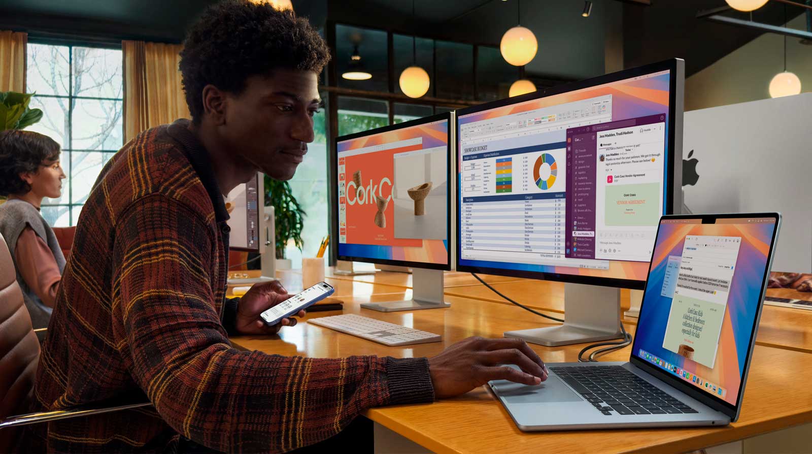 Превратите MacBook Air в идеальное рабочее пространство, подключив до двух внешних дисплеев. Дополнительное пространство экрана упрощает работу с несколькими документами или приложениями.