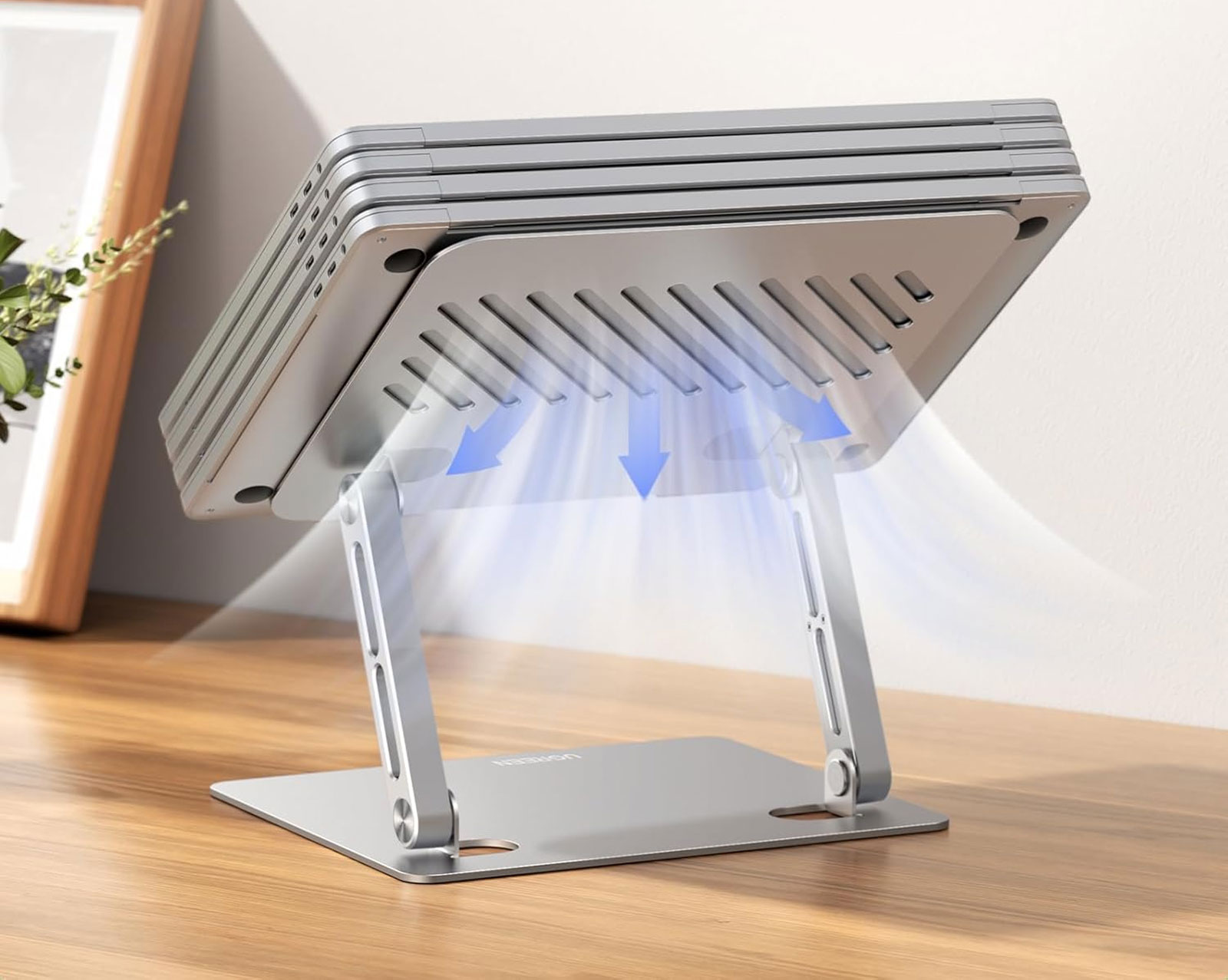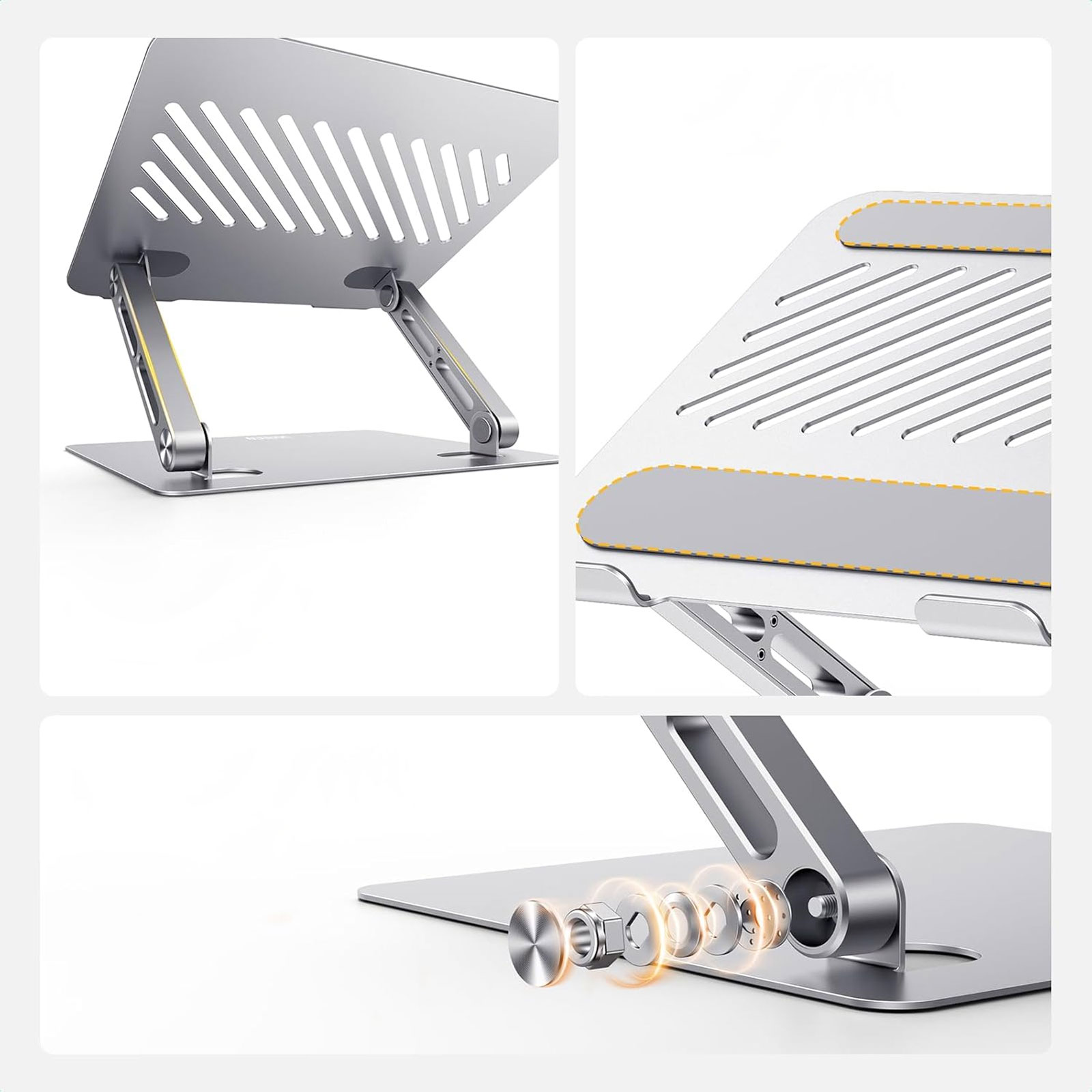 Держатель для ноутбука изготовлен из алюминиевого сплава, он легко поглощает и отводит тепло. Принятие полой конструкции рассеивания тепла, которая может обеспечить отличную вентиляцию и воздушный поток, чтобы ноутбук оставался прохладным и предотвращал перегрев.