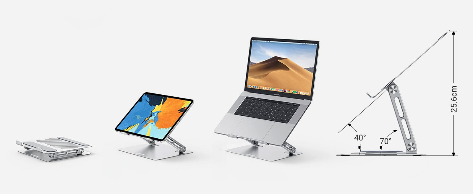 Эта подставка для ноутбука для стола состоит из сверхпрочного металлического основания и алюминиевого двойного стержня, достаточно прочного для размещения вашего телефона и планшета. Открытая алюминиевая конструкция обеспечивает хорошую вентиляцию и воздушный поток, предотвращая перегрев iPad.