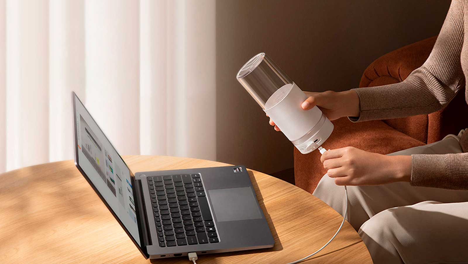 Блендер оснащен аккумулятором ёмкостью 1300 мАч, позволяющим приготовить до 12 чашек стаканов сока на одной зарядке. Порт Type-C обеспечивает универсальность в зарядке: устройство может быть легко подключено к внешним аккумуляторам,