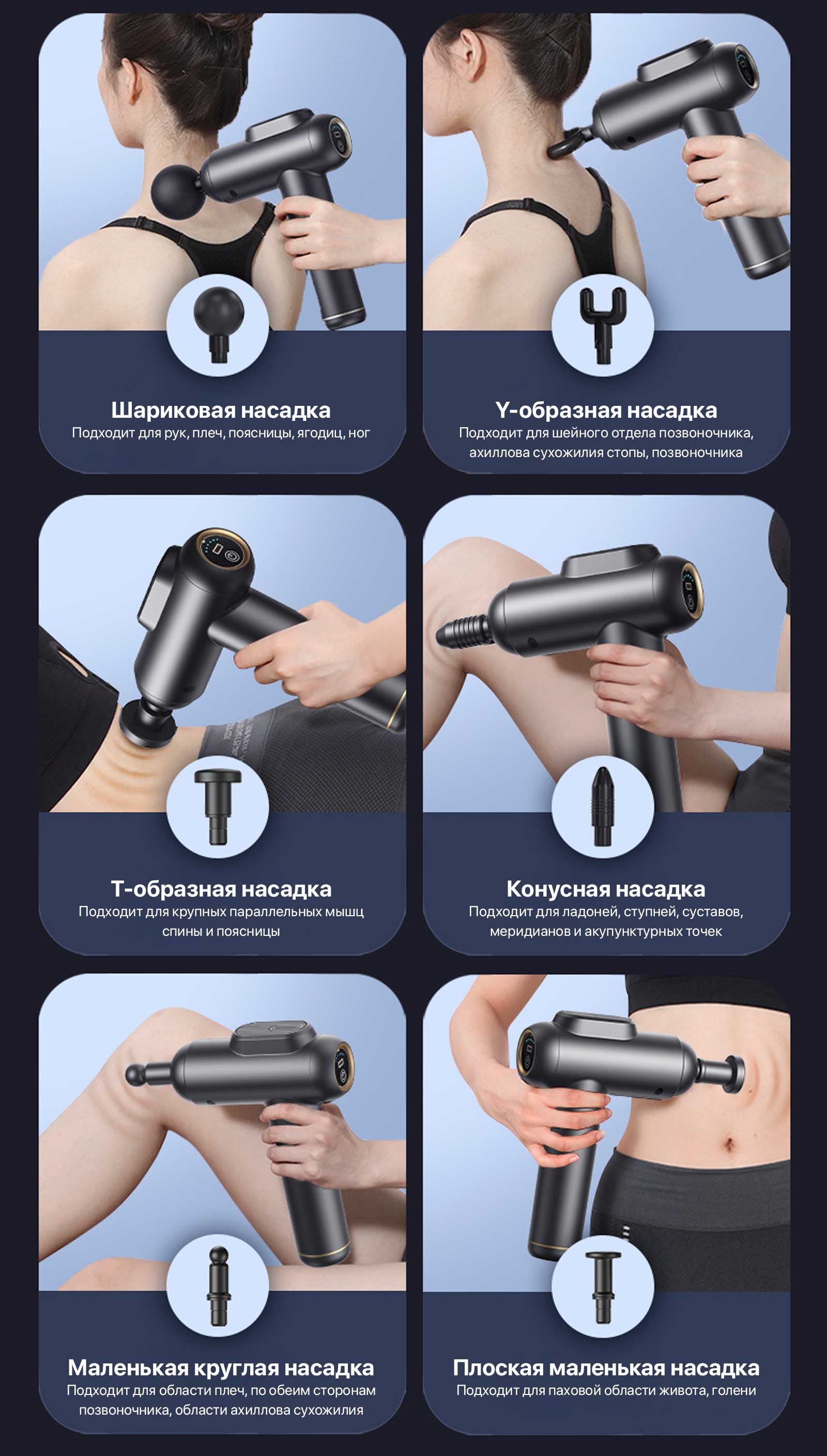 Точно воздействуют на каждую группу мышц. Строго следуя теории распределения давления на мышечные группы и кости. Подбираем соответствующую насадку, бережно заботясь о каждой группе мышц