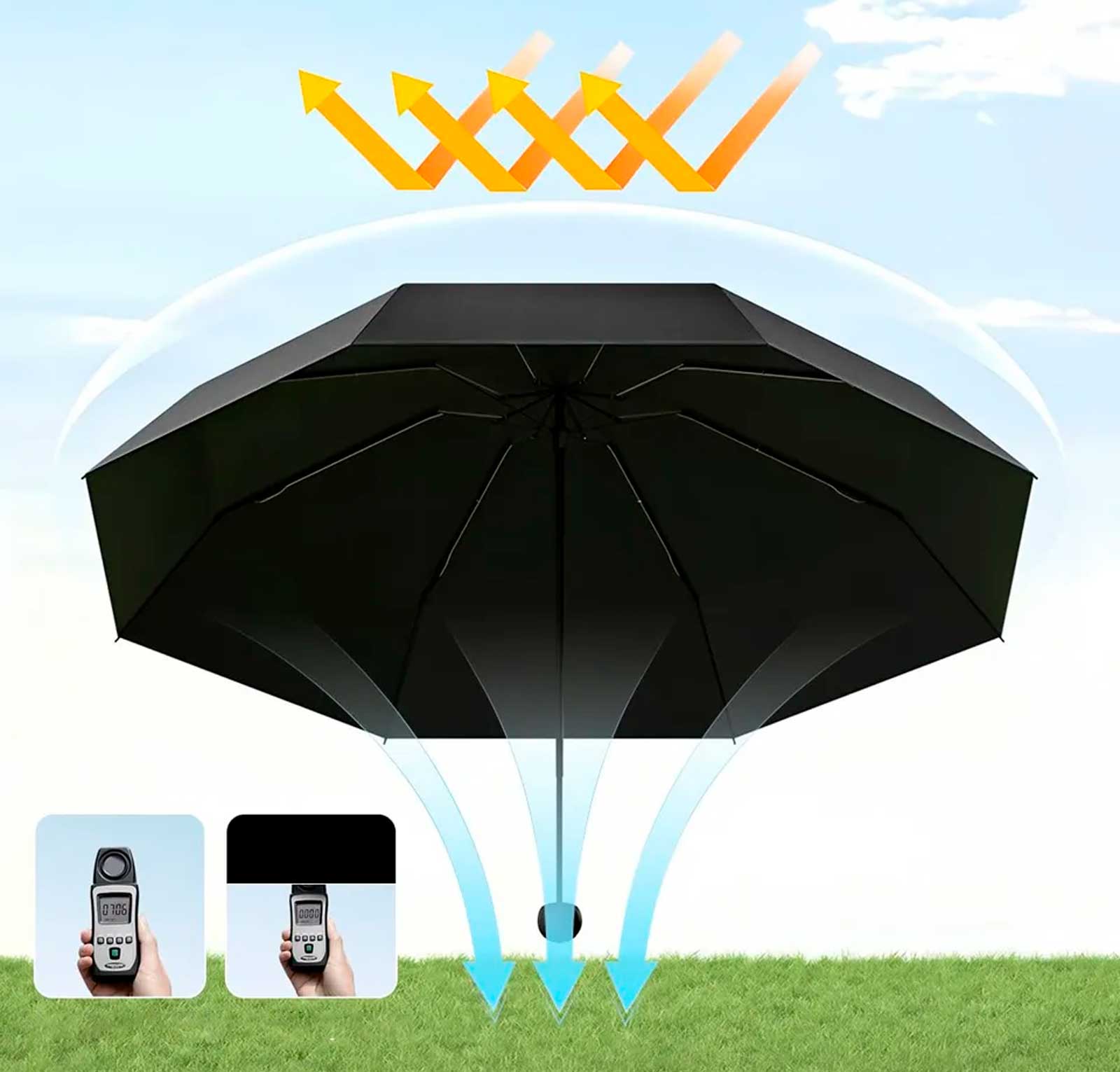 Зонт оснащён дополнительным защитным слоем с уровнем защиты UPF 50+, который блокирует до 100% ультрафиолетовых лучей. Это помогает снизить нагрев под куполом и уменьшает воздействие солнца на кожу, обеспечивая более комфортное