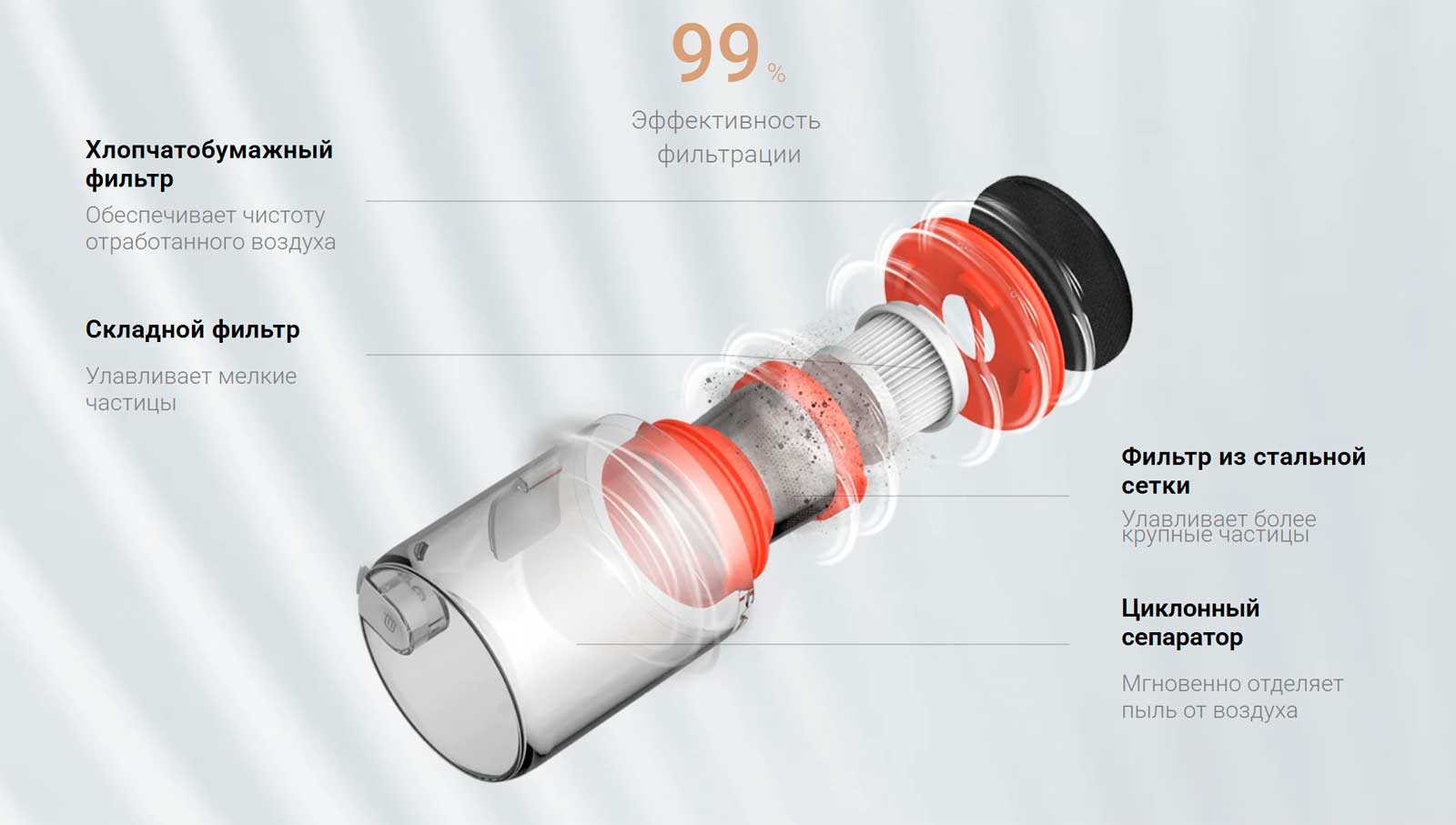 Циклонный сепаратор выпускает чистый воздух. Улучшенная циклонная система пылеотделения удерживает мелкую пыль и клещей в пылевом отсеке, предотвращая засорение фильтра, обеспечивая чистоту отработанного воздуха и снижая вторичное