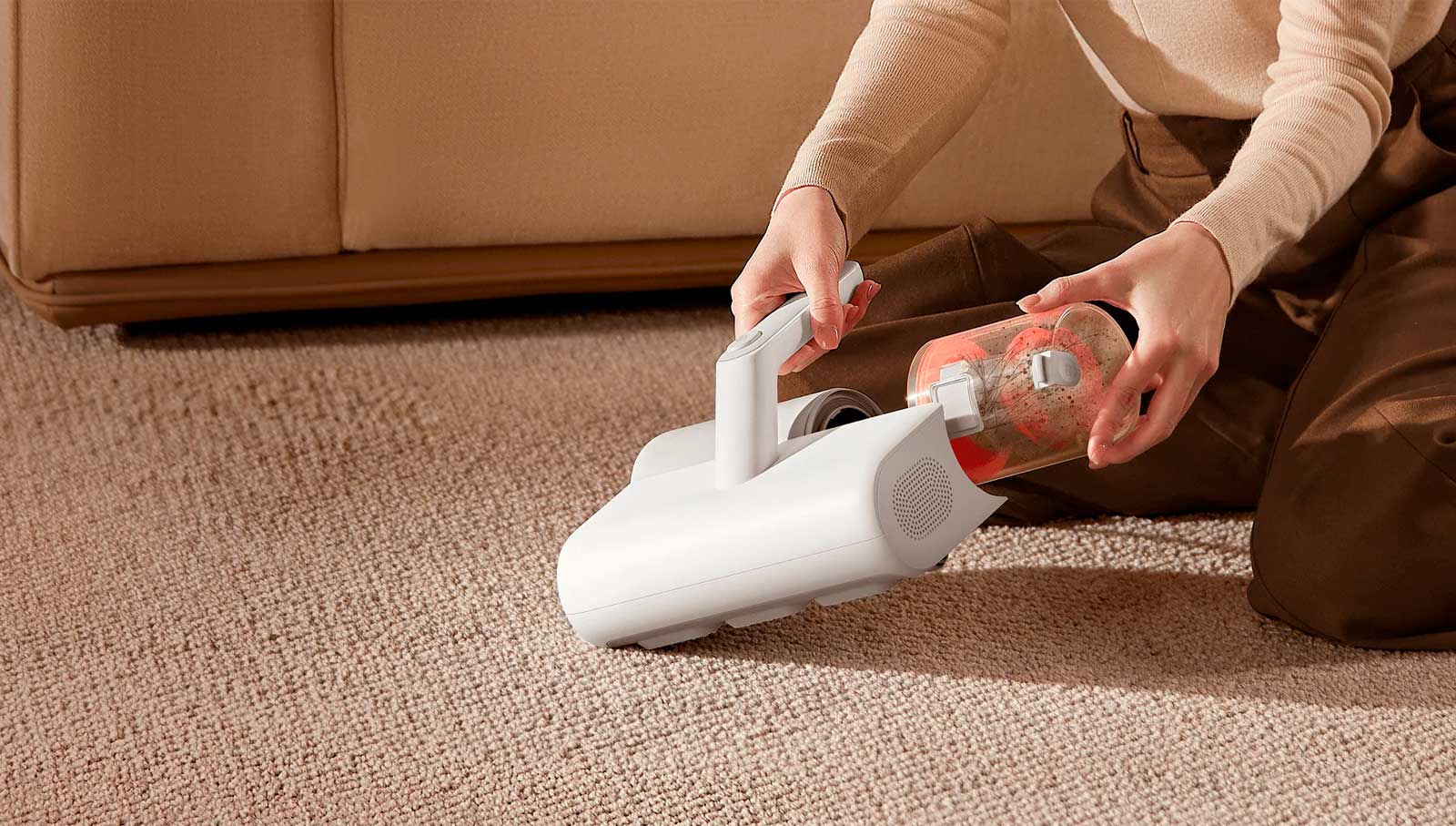 Визуальный контроль эффективности очистки от клещей. Модернизированный прозрачный пылесборник позволяет легко контролировать процесс очистки. Кроме того, он отсоединяется одним нажатием для простого и удобного удаления пыли.