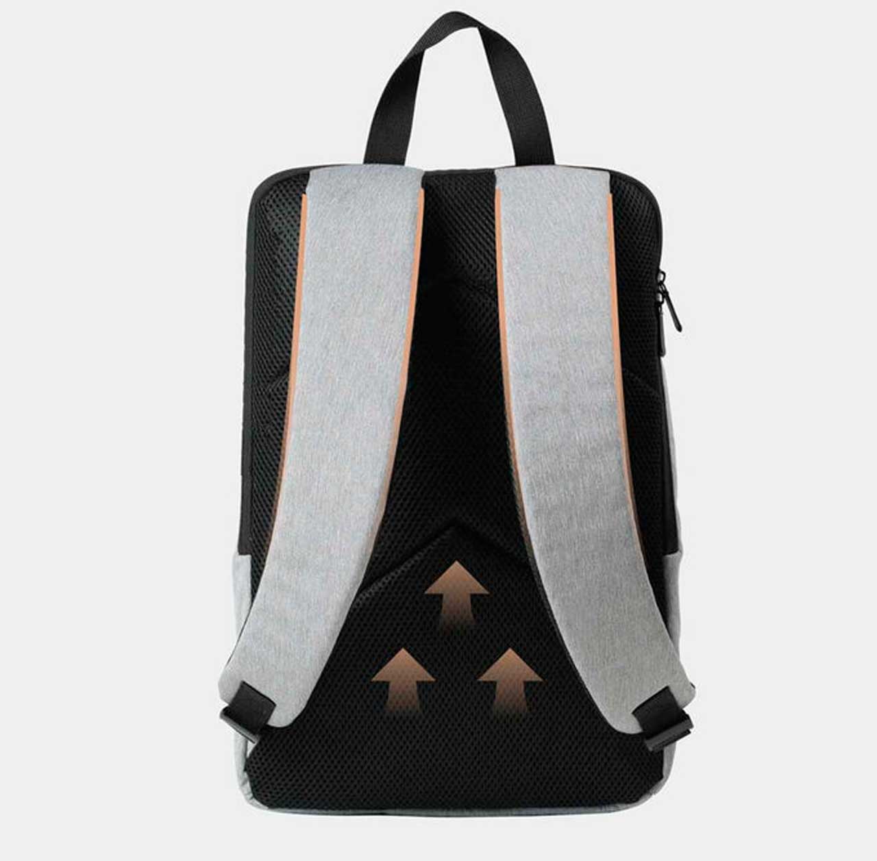 Плечевые ремни рюкзака соответствуют эргономическим принципам. Их дугообразная обтекаемая форма совпадает с изгибами человеческого тела, снижая нагрузку на плечи и позвоночник. Спинка имеет поперечные линии для отвода тепла, что бы