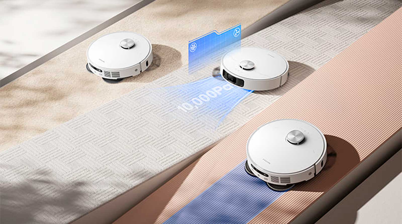 Мощная система всасывания Vormax обеспечивает мощность всасывания 10 000 Па для превосходной уборки. Плавающая резиновая щетка обеспечивает легкое распутывание волос, а ультразвуковое распознавание ковров и подъем швабры