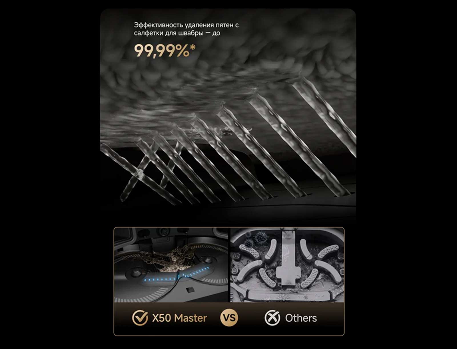 Благодаря двигателю TurboForce шестого поколения, поддерживающему скорость вращения до 90 000 об/мин, система VormaxTM может обеспечивать мощность всасывания 20 000 Па, что позволяет роботу-пылесосу X50 Master убирать мусор даже из