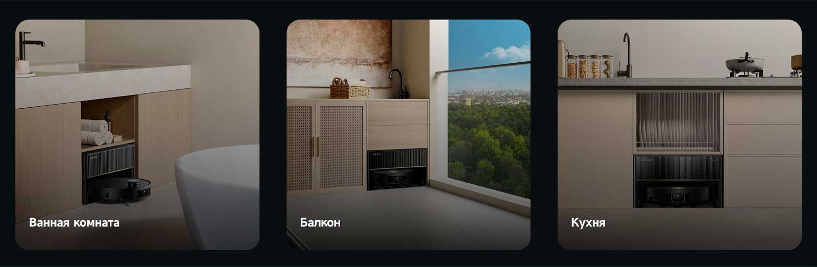 Различные варианты установки позволяют гармонично встроить базовую станцию в интерьер вашего дома. Вне зависимости от места установки будь то кухня — ванная комната или балкон — вы сможете наслаждаться уборкой без хлопот благодаря