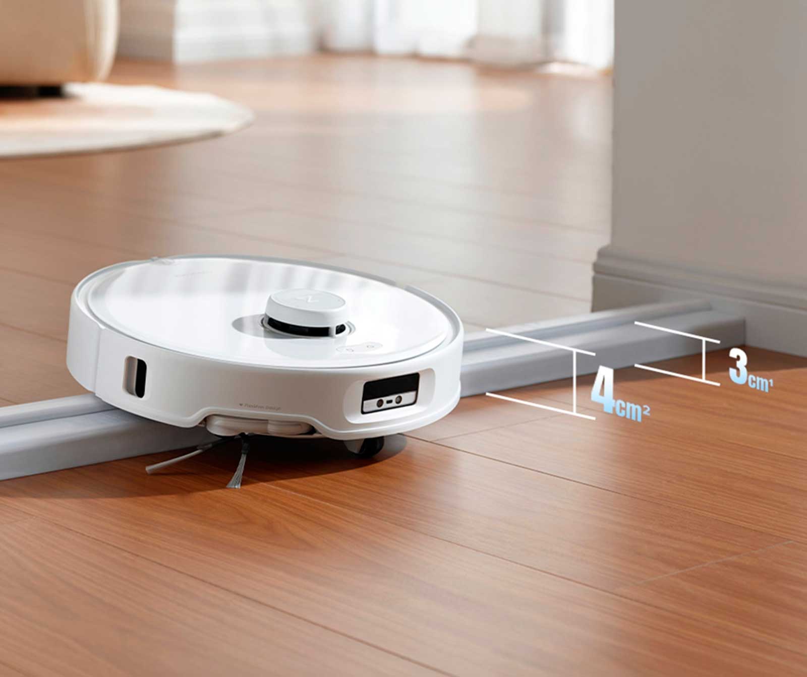 Roborock Qrevo Curv легко преодолевает высокие пороги, автоматически поднимая своё универсальное колесо. Он может преодолевать стандартные пороги высотой до 3 см и даже сложные двухслойные пороги высотой до 4 см, самые высокие в отрасли, обеспечивая непрерывное движение по различным поверхностям.