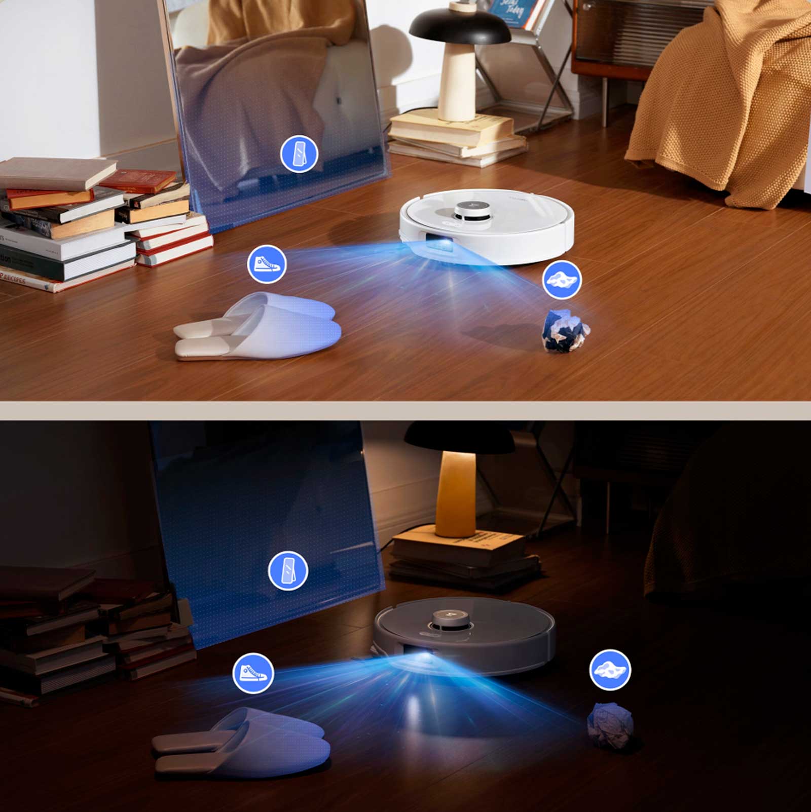 Оснащённый структурированным освещением и RGB-камерой, робот распознаёт 62 типа объектов и избегает их. Он плавно объезжает препятствия как в светлых, так и в тёмных помещениях, снижая потребность в ручном управлении.
