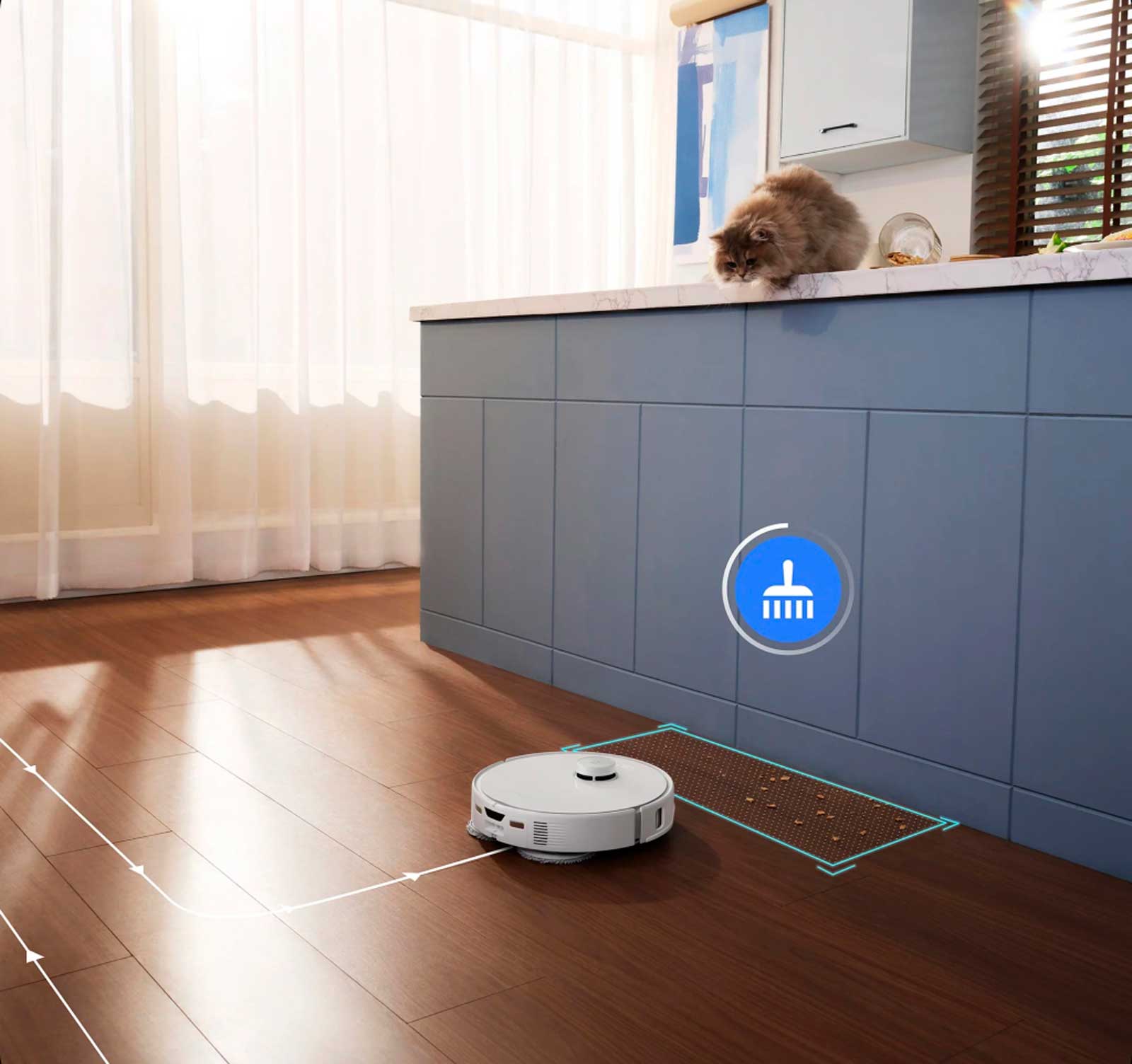 Быстро устраняет неожиданные разливы и загрязнения, а при необходимости обходит определённые зоны, обеспечивая тщательную уборку в соответствии с текущими потребностями.