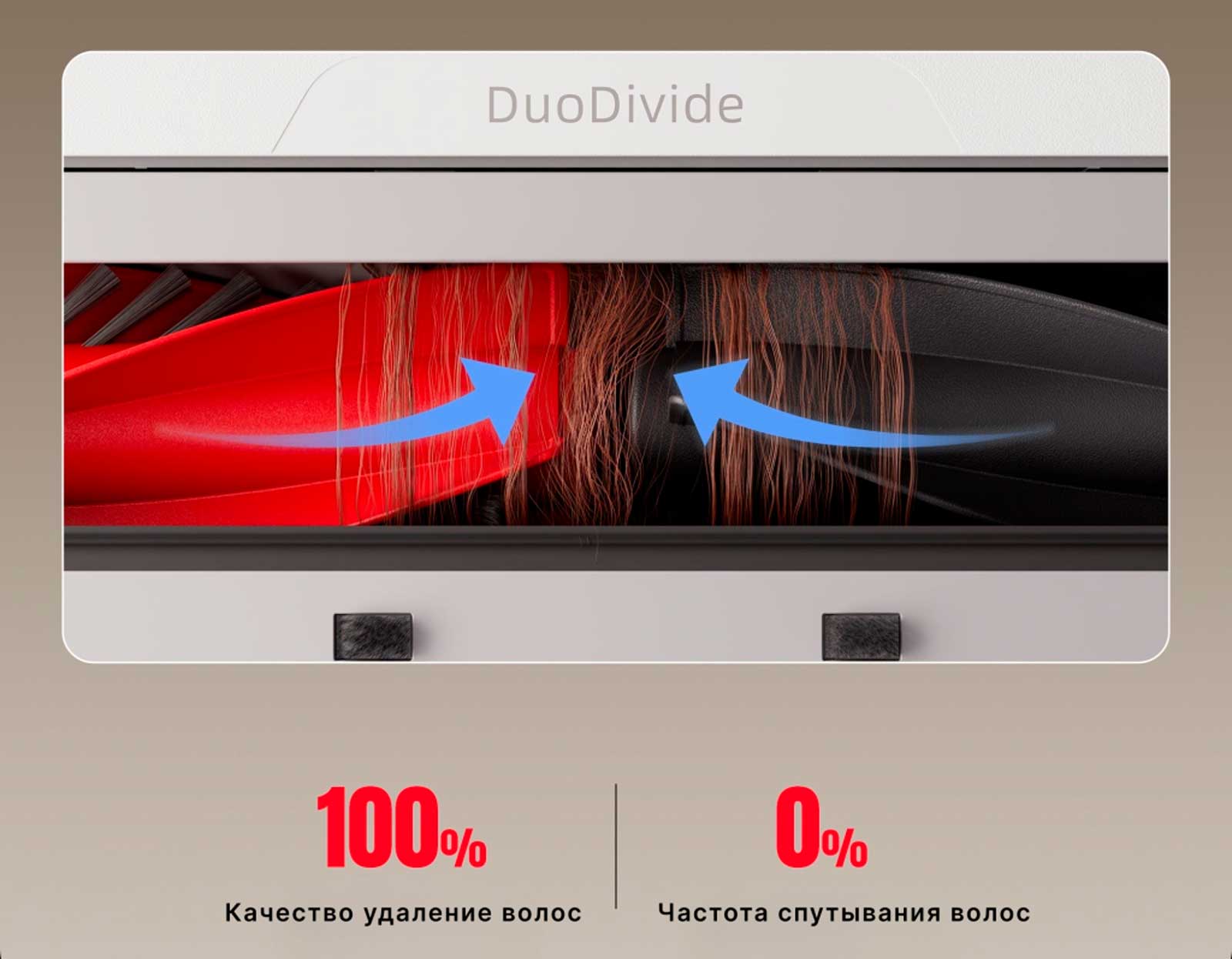 Щётка Duo Divide оснащена двумя параллельными роликами с короткой щетиной и спиралевидными лопастями, которые направляют волосы к центральному отверстию пылесборника, откуда мощный поток воздуха быстро удаляет их. Конструкция предотвращает спутывание и засорение, обеспечивая лёгкую очистку.