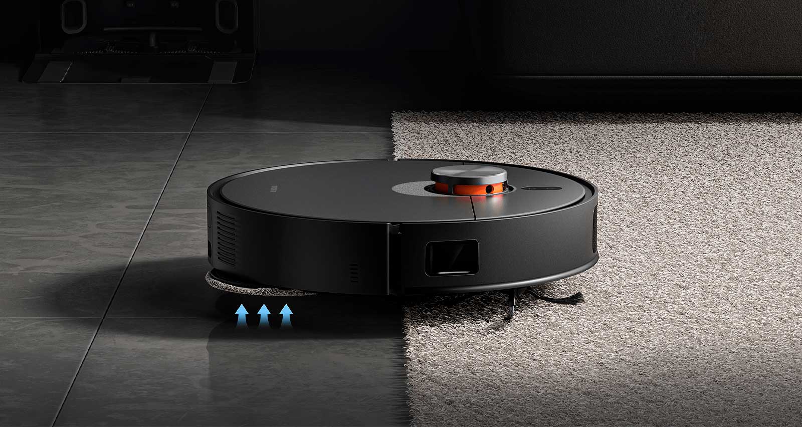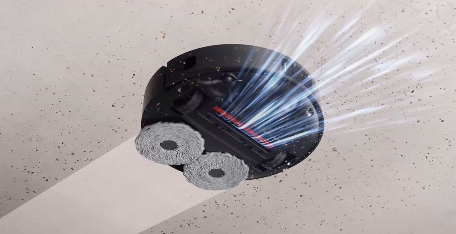 Автоматический подъем насадки для влажной уборки. Устройство оснащено ультразвуковым датчиком, который автоматически активирует подъем насадок для влажной уборки на 10 мм при обнаружении ковра. В режиме ускорения с обнаружением