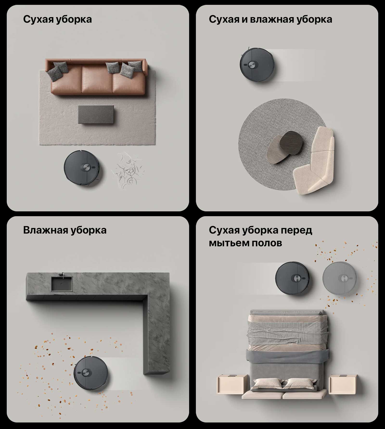 Подходит для различных напольных покрытий. В приложении Mi Home/Xiaomi Home предлагается четыре режима уборки. Благодаря различным настройкам всасывания и регулируемой подаче воды устройство подходит для уборки в различных домашних