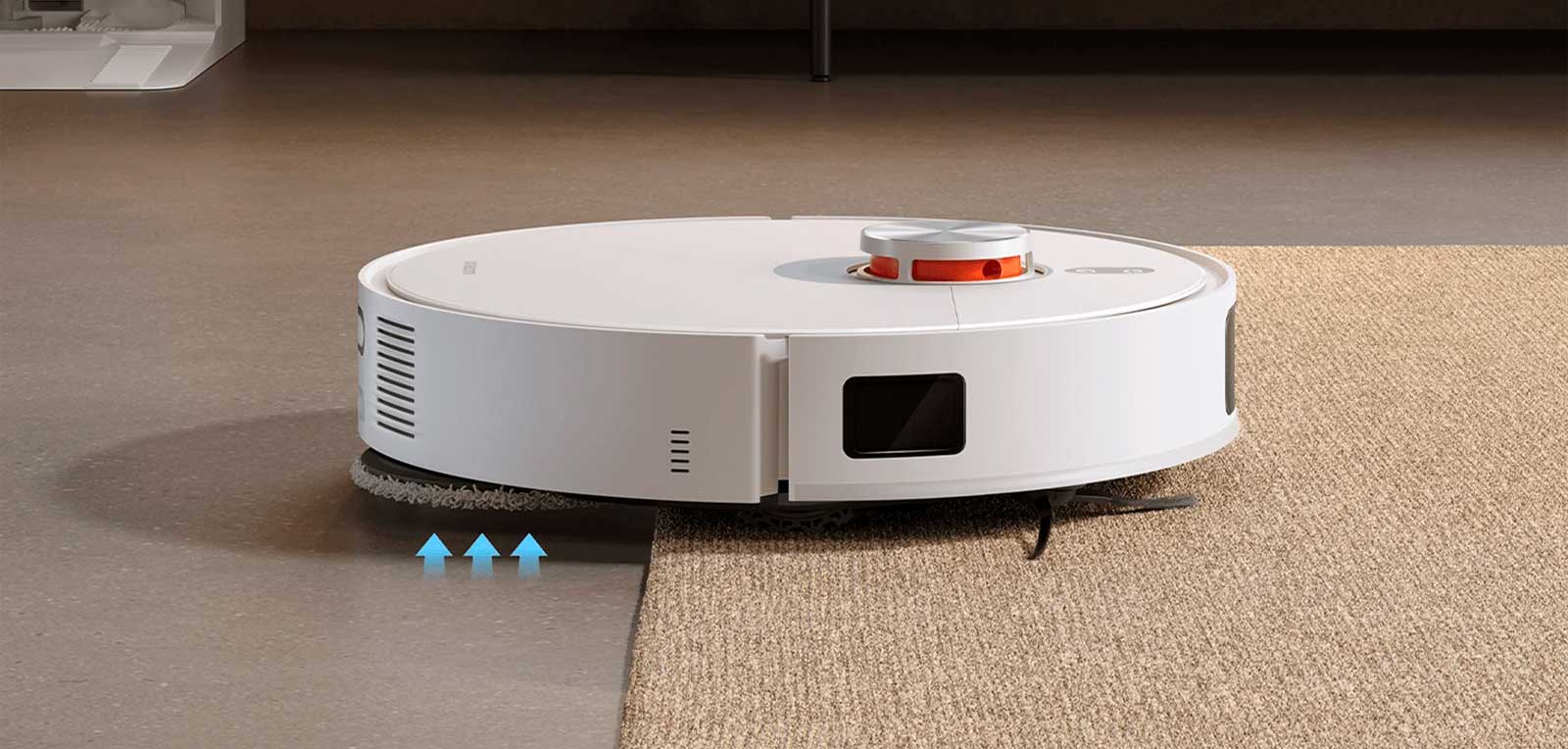 Автоматический подъем насадки для влажной уборки. Устройство оснащено ультразвуковым датчиком, который автоматически активирует подъем насадок для влажной уборки на 10 мм при обнаружении ковра. В режиме ускорения с обнаружением