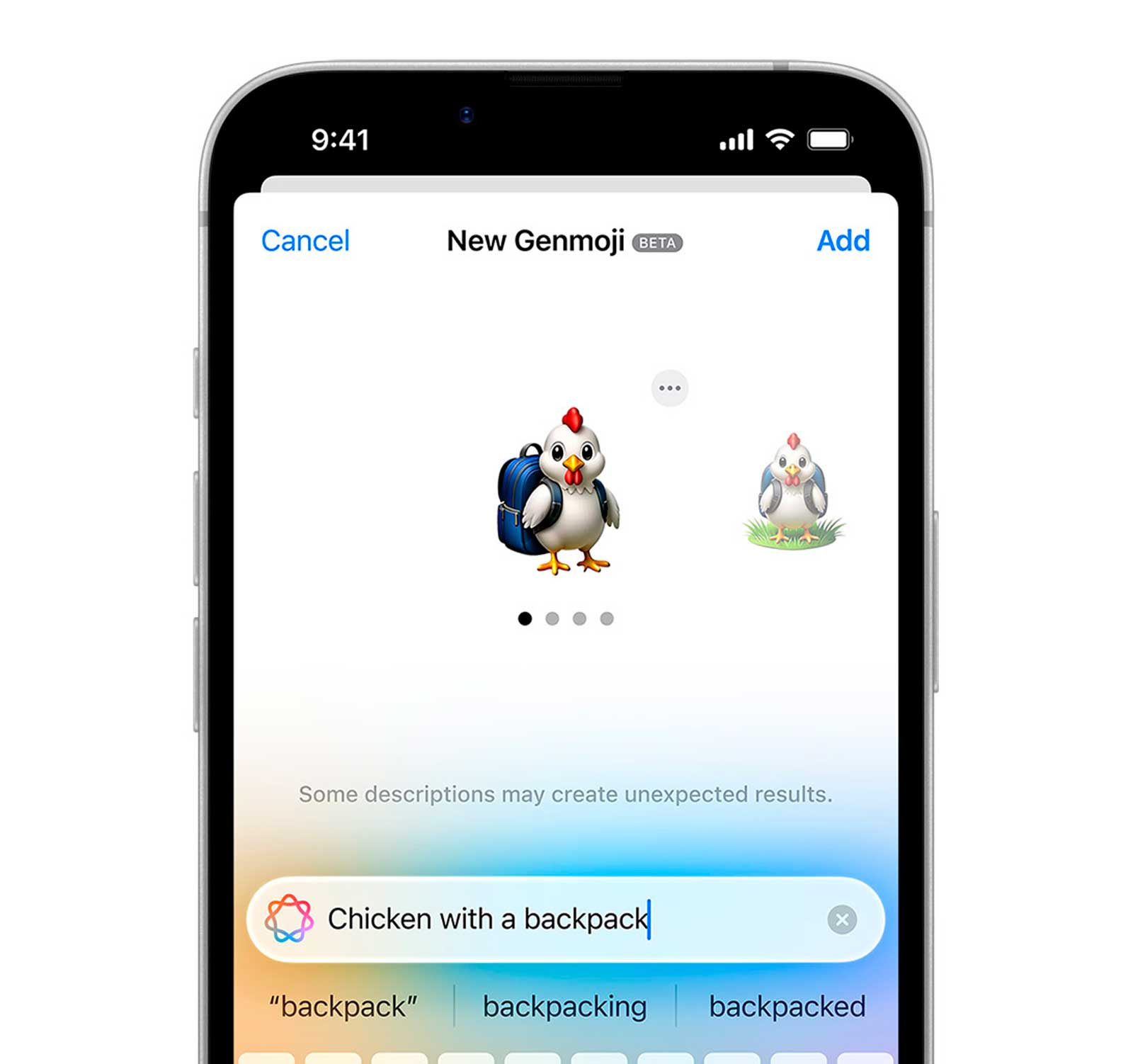 Создайте Genmoji прямо на клавиатуре, чтобы соответствовать любому разговору. Хотите создать курицу с рюкзаком? Вы получили это. Просто дайте описание.