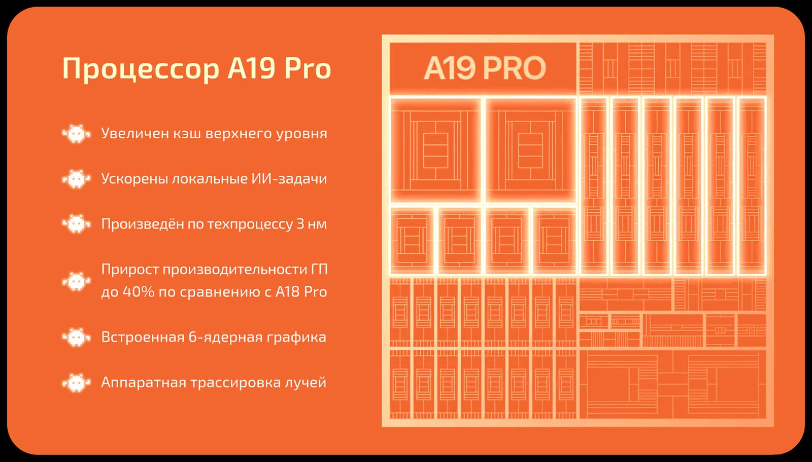 Чип A19 Pro – очередной прорыв в производительности. В повседневных задачах он быстрее предыдущего флагманского A18 Pro примерно на 10%, но графика прокачалась куда сильнее: до 40% прироста. В iPhone 17 Pro и iPhone 17 Pro Max
