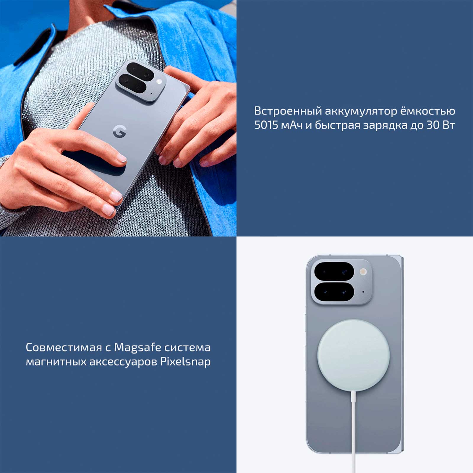 подойдёт не только любая беспроводная зарядка стандарта Qi или Qi2, но и магнитное зарядное устройство, ведь смартфон поддерживает Pixelsnap – фирменную систему магнитных аксессуаров, совместимую с MagSafe. А заодно можно