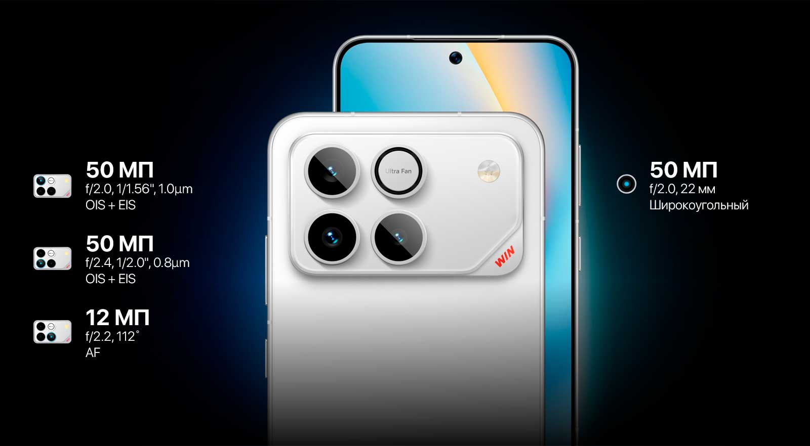 сенсор Sony LYT-700, 50 МП телеобъектив и 12-мегапиксельный сверхширокоугольный объектив, что обеспечивает гибкость съёмки - от детализированных портретов до панорамных сцен. Такая конфигурация выводит Honor Win в категорию