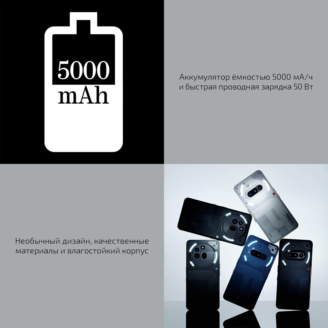 потокового видео, а также позволяет оставаться на связи в течение всего дня без подзарядки. Традиционно для Nothing, смартфон радует и поддержкой последних на момент его выхода версий беспроводных стандартов.