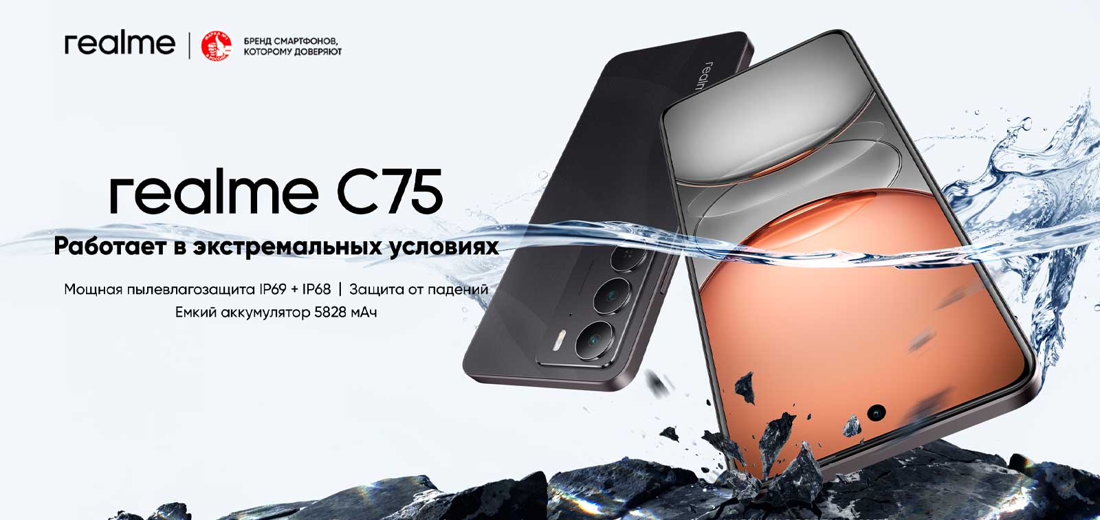 Благодаря передовым технологиям защиты от воды и модернизации конструкции realme C75 проходит тест на погружение в воду на глубину до 2 метров на 24 часа. Будь то ежедневные брызги или случайное погружение в воду, realme C75