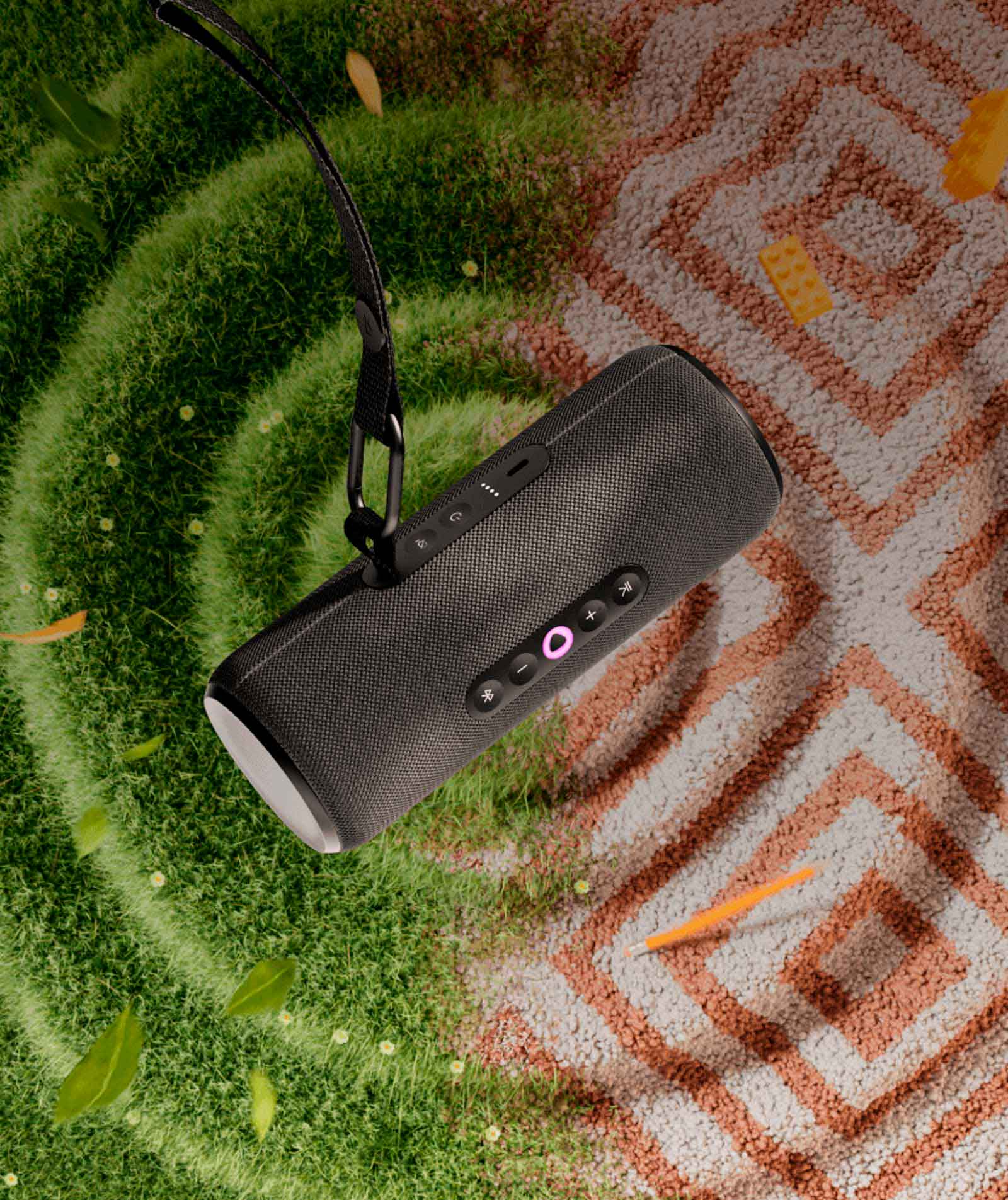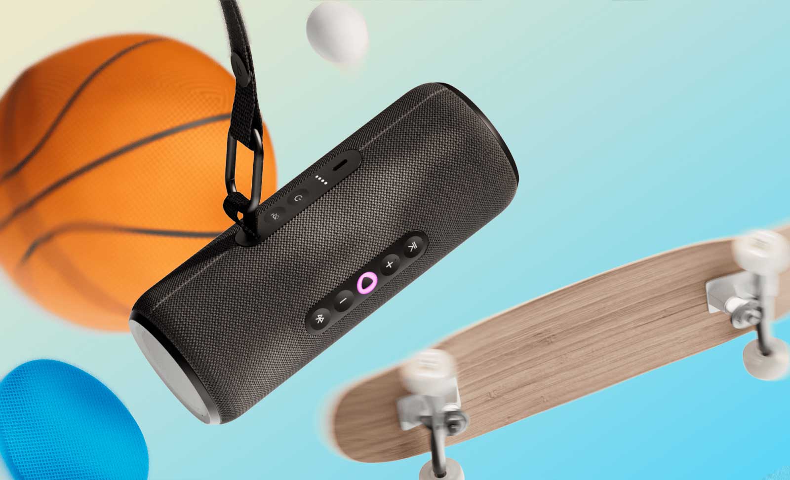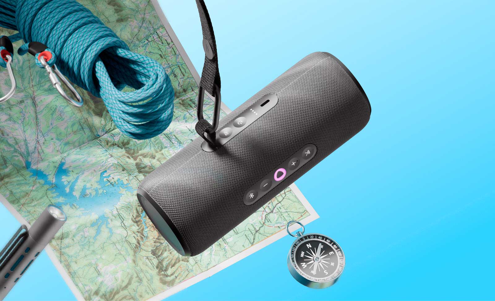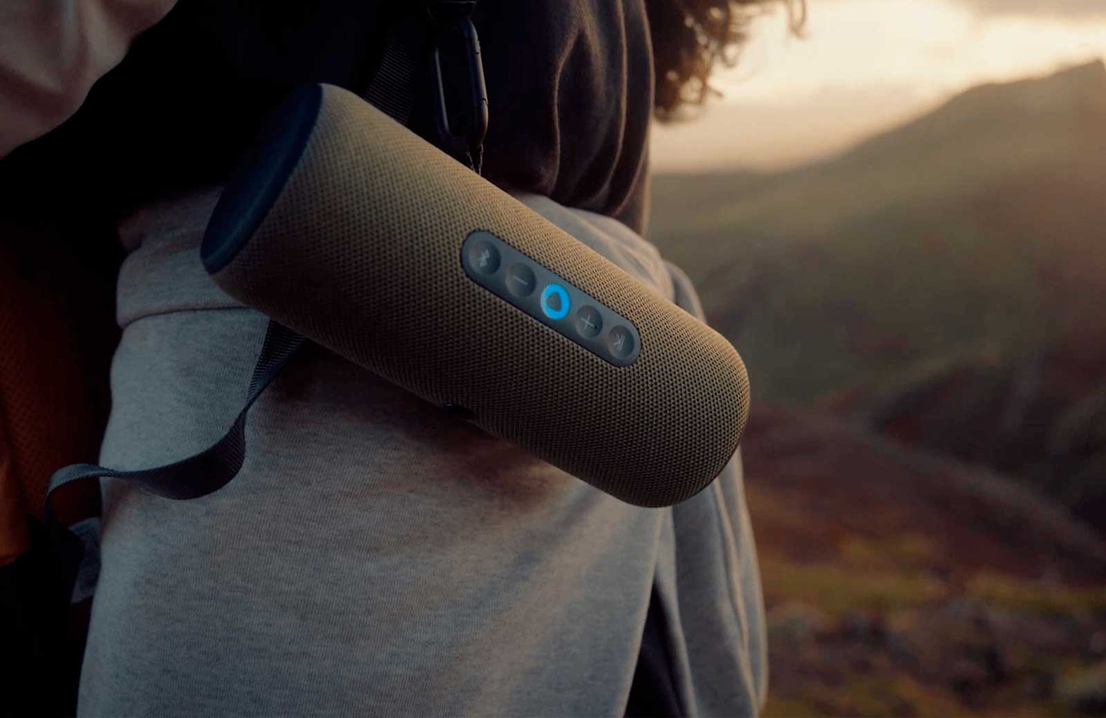 Яндекс Станцию Стрит удобно держать в руке, ставить вертикально или горизонтально, а с помощью съёмного ремешка с карабином её можно вешать, куда захотите — например, на рюкзак.