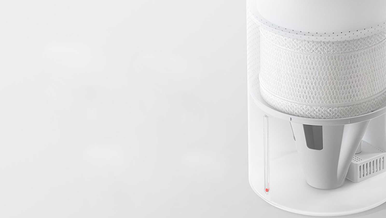 Конструкция устройства разработана для удобства разборки и тщательной очистки. Система увлажнителя состоит из четырех ключевых компонентов: 3D фильтра, прочного держателя для фильтра, бака для воды, обогащенного ионами серебра, и