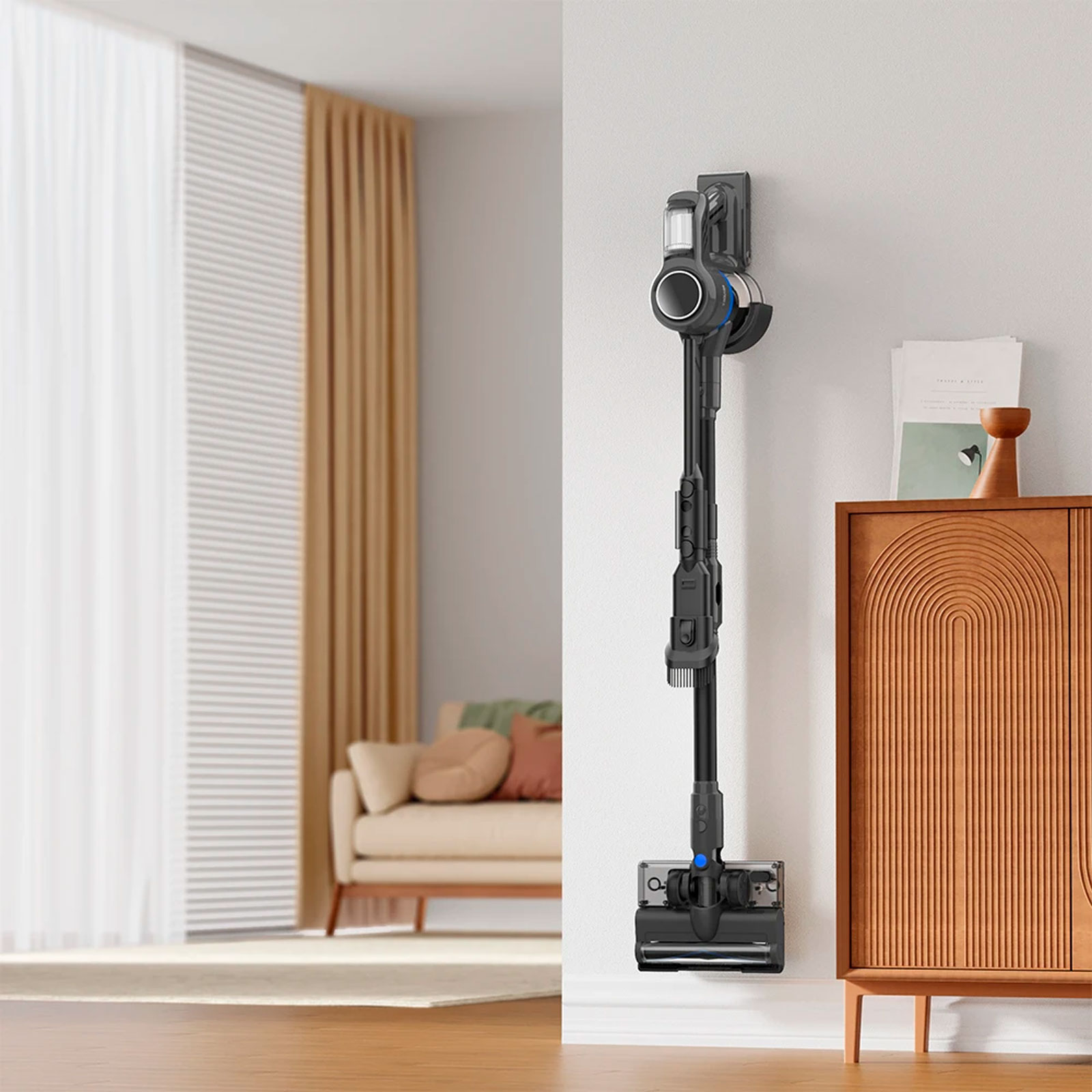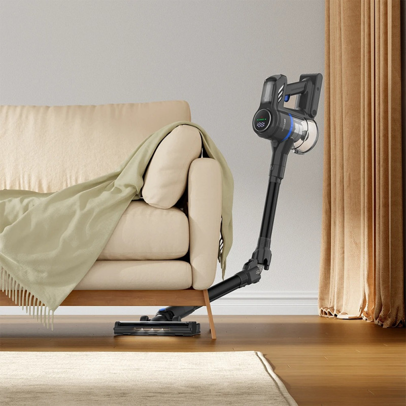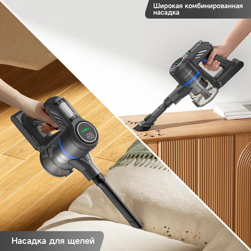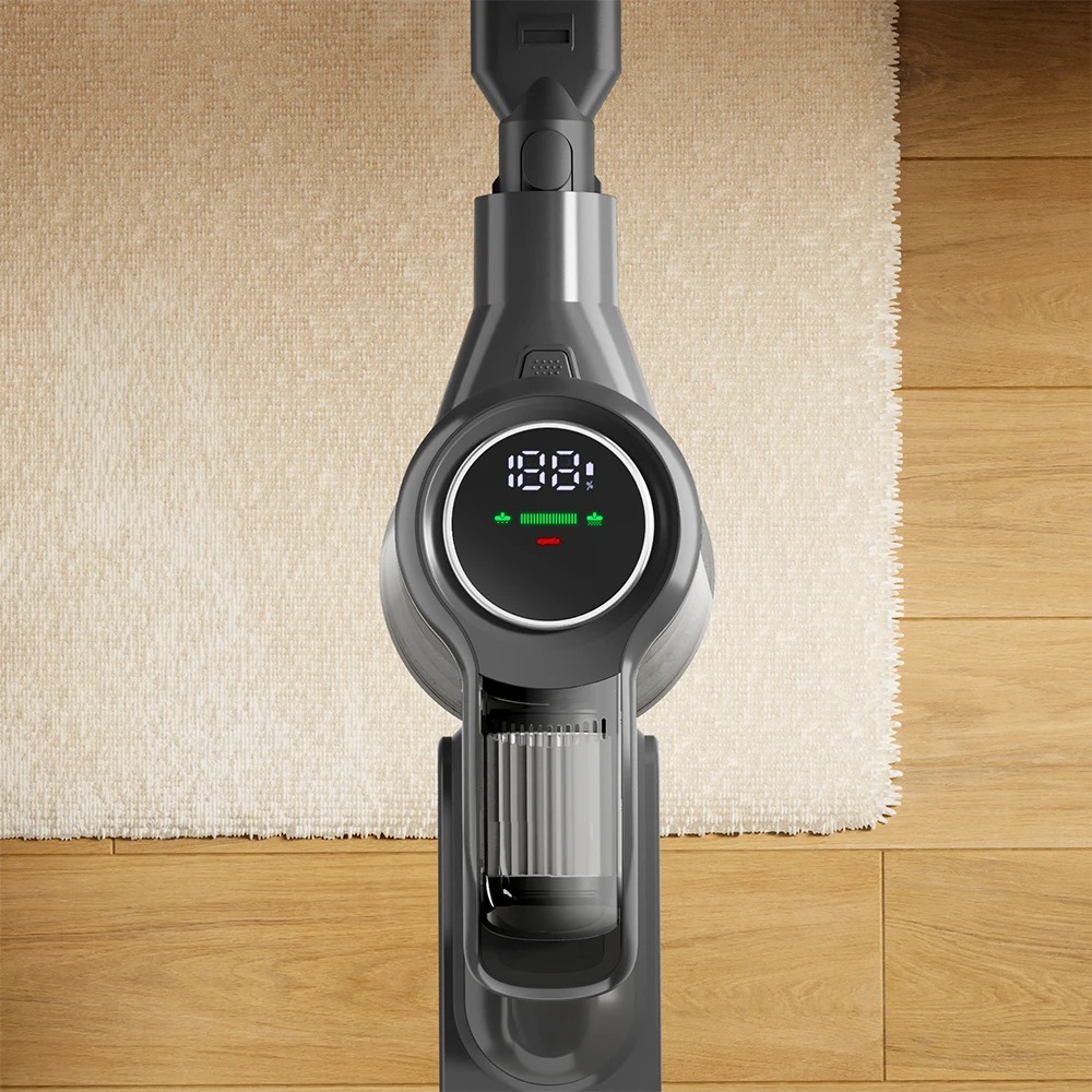 Удобный светодиодный сенсорный экран предлагает интуитивно понятный интерфейс, включая четкое отображение состояния аккумулятора и возможность легко переключаться между режимами мощности всасывания одним касанием.