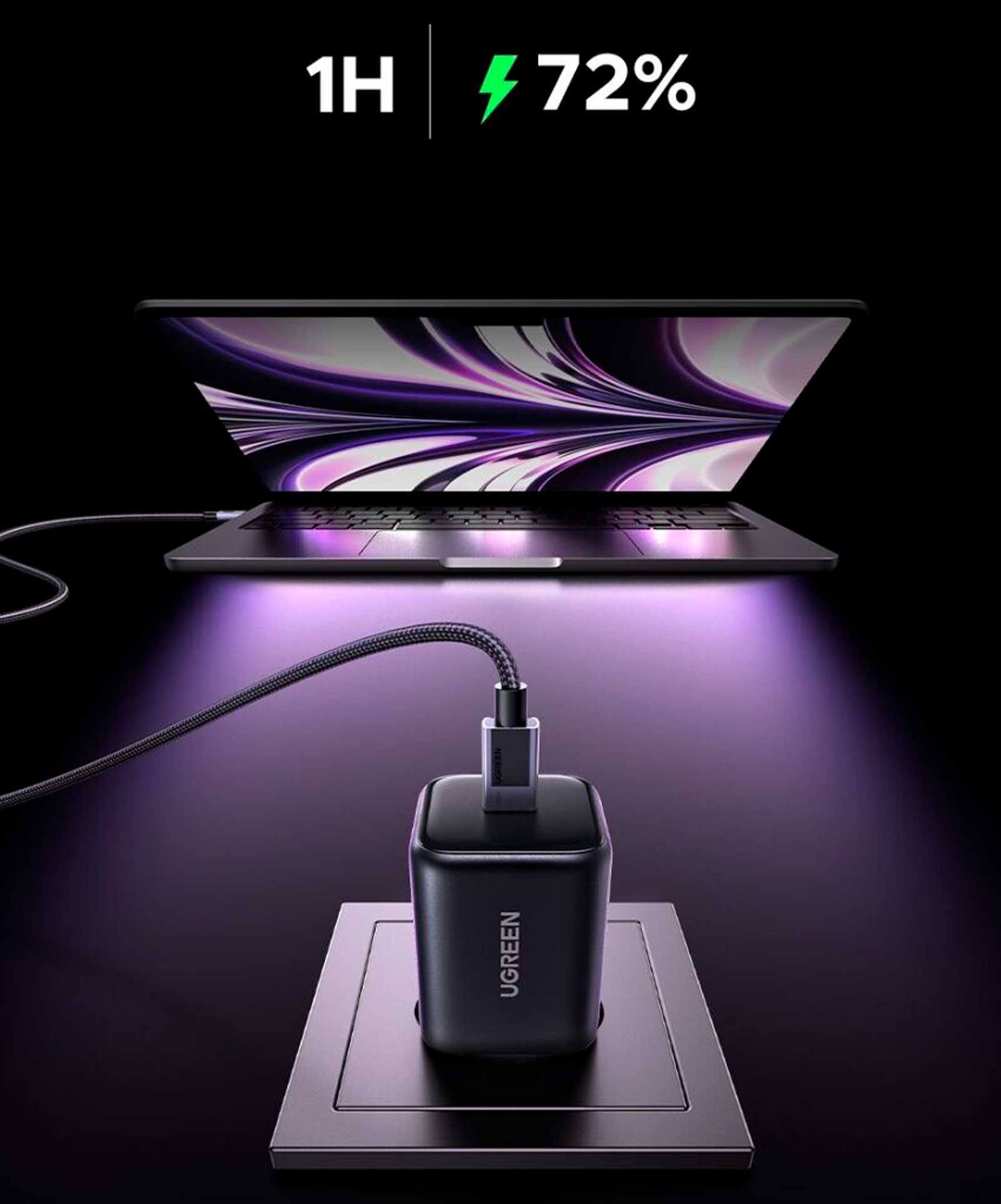Использование современных компонентов на основе нитрида галлия (GaN) позволяет сделать зарядное устройство более компактным, при этом сохраняя высокую мощность и эффективность. Такой адаптер меньше нагревается, работает стабильнее и